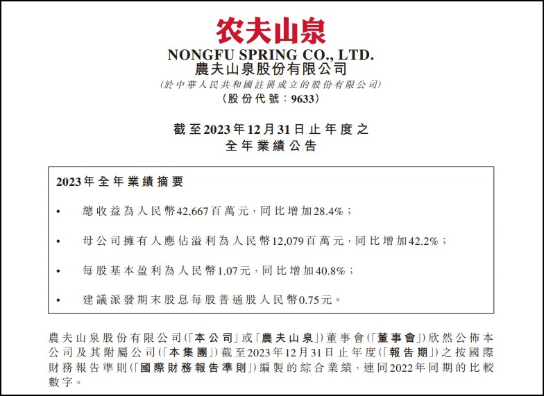 3月26日,農(nóng)夫山泉發(fā)布2023全年業(yè)績報告。2023年總收益為426.67億元,同比增加28.4%;母公司擁有人應(yīng)占溢利為120.79億元,同比大漲42.2%;經(jīng)營活動現(xiàn)金流同比增加43.7%至173.05億元。每股基本盈利為1.07元,同比增加40.8%。 分產(chǎn)品來看,2023年農(nóng)夫山泉的包裝飲用水產(chǎn)品實現(xiàn)營收202.62億元,較2022年增長10.9%,占總營收的比重為47.5%。農(nóng)夫山泉在年報中提到,2023年集團加大了對農(nóng)夫山泉優(yōu)質(zhì)水源地的宣傳,先后推出了以長白山、峨眉山、太白山和萬綠湖四個水源地為主題的宣傳廣告,通過展現(xiàn)各水源地的自然環(huán)境、物種生態(tài)和氣候水文等,向消費者宣傳農(nóng)夫山泉的天然優(yōu)質(zhì)水源和產(chǎn)品的差異性。升級回歸了農(nóng)夫山泉4L裝天然水產(chǎn)品的“把手瓶”,深化4L把手瓶天然水產(chǎn)品的后廚用水定位,進一步拓展水產(chǎn)品的使用場景。 茶飲料產(chǎn)品增速明顯。2023年農(nóng)夫山泉茶飲料產(chǎn)品錄得全年收益126.59億元,同比暴漲83.3%,占2023年總營收的29.7%。農(nóng)夫山泉表示,東方樹葉在2023年不斷上新,推出新口味及新規(guī)格產(chǎn)品,滿足消費者更多場景飲用需求。 此外,以“尖叫”“力量帝”維他命水為代表的功能飲料產(chǎn)品在2023年實現(xiàn)營收49.02億元,較2022年增長27.7%,占2023年總收益的11.5%。以NFC系列、水溶C100等為代表的果汁飲料產(chǎn)品實現(xiàn)營收35.33億元,同比增長22.7%,占2023年總收益的8.3%;其他產(chǎn)品主要包括蘇打水飲料、含氣風(fēng)味飲料、檸檬汁飲料、咖啡飲料等,在2023年實現(xiàn)營收13.11億元,同比下降3.1%,占2023年總收益的3.0%。 農(nóng)夫山泉在年報中指出,2023年中國食品飲料行業(yè)需求弱復(fù)蘇,全國飲料累計產(chǎn)量175百萬噸,累計增長4.1%。根據(jù)行業(yè)數(shù)據(jù),飲料各品類的增長和占比情況,除碳酸飲料為正增長外,其他品類均出現(xiàn)負增長;以茶飲料、蛋白飲料、特殊用途飲料為代表的“非三大”飲料占比加大,營養(yǎng)性、功能性的產(chǎn)品更容易獲得積極的市場反饋。 值得關(guān)注的是,農(nóng)夫山泉創(chuàng)始人鐘睒睒在年報的致辭中表示,2023年,農(nóng)夫山泉取得了茶飲料的高速增長,包裝飲用水和飲料雙引擎格局進一步夯實。他著重表示,“代表農(nóng)夫山泉感謝每位員工的付出和堅持,公司有你們才有未來;將在即將舉行的2023年度股東大會上建議派發(fā)截至2023年12月31日止年度末期現(xiàn)金股息每股人民幣0.75元,并感謝所有經(jīng)銷商和合作伙伴對農(nóng)夫山泉的信任和支持! |