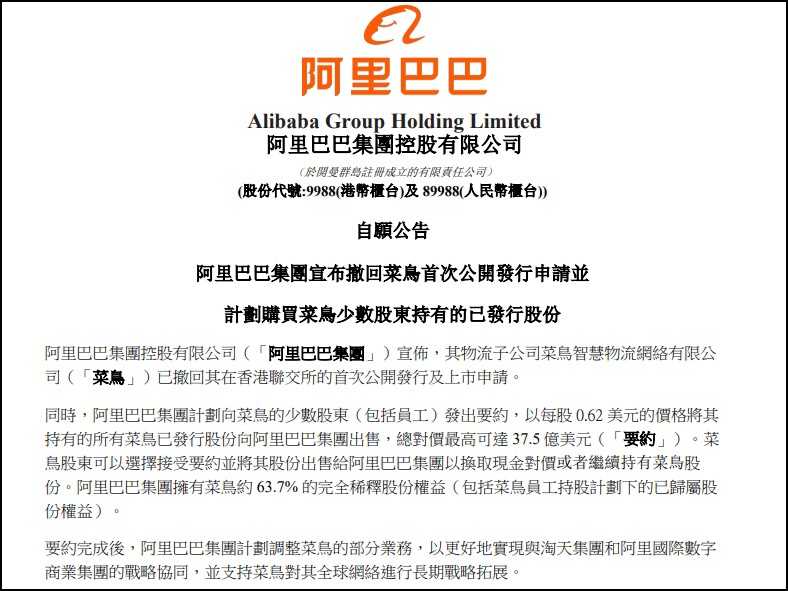 3月26日,阿里巴巴集團(tuán)發(fā)布公告稱,決定撤回物流子公司菜鳥智慧物流網(wǎng)絡(luò)有限公司在港交所提交的上市申請(qǐng),并要約收購菜鳥少數(shù)股東的股權(quán)和員工已歸屬的股權(quán)。本次收購涉及金額達(dá)37.5億美元。阿里巴巴在公告中透露,為更好加強(qiáng)與阿里電商業(yè)務(wù)協(xié)同,以及繼續(xù)支持菜鳥擴(kuò)大全球物流網(wǎng)絡(luò)投入。 2023年5月,阿里巴巴宣布一項(xiàng)資產(chǎn)重組計(jì)劃,其中包括菜鳥的IPO。2023年9月26日,菜鳥向港交所遞交招股書。彼時(shí),阿里巴巴認(rèn)為單獨(dú)上市更能體現(xiàn)菜鳥作為阿里巴巴重要業(yè)務(wù)的價(jià)值。 但現(xiàn)如今,阿里巴巴對(duì)于菜鳥的定位有了新的變化,阿里巴巴方面稱,經(jīng)綜合考量,現(xiàn)在IPO無法凸顯菜鳥作為全球電商物流領(lǐng)先企業(yè)的內(nèi)在價(jià)值。阿里巴巴表示,撤回菜鳥IPO與監(jiān)管無關(guān),不會(huì)出售持有的快遞公司股份。 |