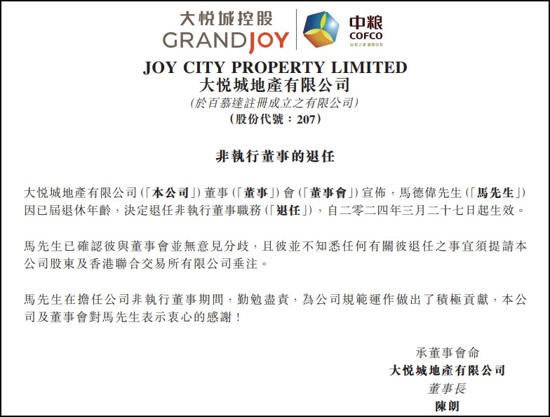 3月27日,大悅城地產(chǎn)有限公司宣布,非執(zhí)行董事馬德偉先生因達(dá)到退休年齡,自2024年3月27日起退任其職務(wù)。 他已確認(rèn)與董事會(huì)之間并無(wú)意見(jiàn)分歧,且未獲悉任何需引起股東及香港聯(lián)合交易所關(guān)注的相關(guān)事宜。 大悅城地產(chǎn)有限公司強(qiáng)調(diào),馬先生的退任不會(huì)對(duì)公司的運(yùn)營(yíng)及管理造成影響。 |