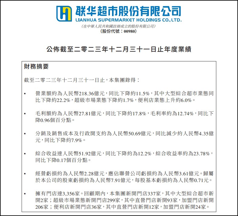 3月27日晚間,聯(lián)華超市發(fā)布截至12月31日的年度業(yè)績。 報告期內(nèi),聯(lián)華超市營業(yè)額約為218.3億元,同比下降約11.5%;經(jīng)營虧損約2.28億元;歸屬于公司的股東虧損約為7.91億元,而2022年虧損2.06億元;毛利額約為27.81億元,同比下降約17.8%;毛利率約為12.74%,同比下降0.96個百分點;每股基本虧損約為0.71元。 聯(lián)華超市表示,2023年營業(yè)額下滑,是因為商超行業(yè)的復(fù)蘇速度低于餐飲等其他消費行業(yè),門店來客受到一定影響,普通民眾消費更加理性,消費降級趨勢明顯,同時受年初疫情對春節(jié)銷售旺季的影響,致營業(yè)額同比下降。同時,聯(lián)華超市強(qiáng)調(diào),在線到家業(yè)務(wù)呈穩(wěn)定增長,在線銷售同比增長12% 大型綜合超市業(yè)態(tài)營業(yè)額約96.46億元,同比下降22.2%,占集團(tuán)營業(yè)額約為44.2%;毛利額約13.43億元,同比減少約4.16億元;毛利率同比下降0.27個百分點至13.92%;毛利額約13.43億元,同比減少約4.16億元;毛利率同比下降0.27個百分點至13.92%。 超級市場業(yè)態(tài)營業(yè)額約105.14億元,同比下降約為1.7%,占集團(tuán)營業(yè)額約48.2%;毛利額約12.42億元,同比下降14.2%;經(jīng)營利潤約0.48億元,同比減少約1.16億元;經(jīng)營利潤率下降1.09個百分點至0.45%。 便利店業(yè)態(tài)錄得營業(yè)額約15.87億元,同比上升約6%,占集團(tuán)營業(yè)額約為7.3%;毛利額約為1.77億元,同比上升約4.4%;受鮮食毛利較低和營促銷活動增加的影響,毛利率下降0.18個百分點至11.16%。 在門店規(guī)模方面,2023年,聯(lián)華超市新開門店337家,其中大型綜合超市新開2家;超級市場業(yè)態(tài)新開門店299家,其中直營門店新開93家,加盟門店新開206家;便利店新開門店36家,其中直營門店新開12家,加盟門店新開24家。同時,聯(lián)華超市梳理了門店網(wǎng)絡(luò),關(guān)閉了333家門店。截至報告期末,聯(lián)華超市擁有門店3356家。 公告提到,回顧期內(nèi),線上到家業(yè)務(wù)呈穩(wěn)定增長,線上銷售較去年同比增長12%。 |