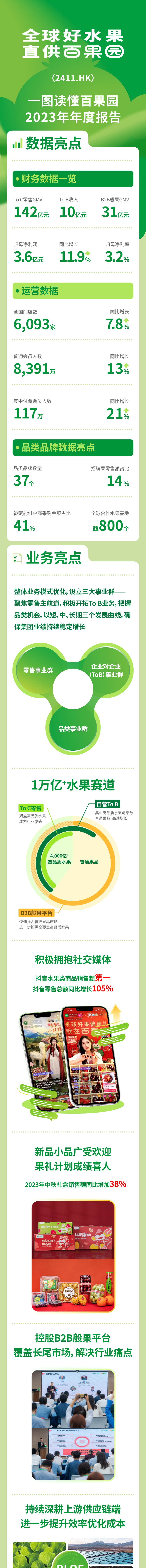 3月28日,百果園發(fā)布2023年年報顯示,報告期內,實現(xiàn)收入113.91億元,同比增長0.7%;歸母凈利潤3.6億元,凈利率為3.2%;實現(xiàn)公司所有者應占溢利3.62億元,同比增長11.9%;所有經銷渠道的會員數(shù)累計超過8300萬名。 百果園是國內頭部水果零售經營商,旗下有“百果園”“果多美”兩個品牌,2023年1月16日在港股上市。年報顯示,2023年,百果園水果及其他食品銷售收入分別為110.73億元,占總收入的97.2%。其余收入來自特許權使用費及特許經營收入、會員收入及其他收入。 2023年上半年,百果園公司組織架構做了重大調整——即分別設立三個事業(yè)群,零售事業(yè)群、企業(yè)對企業(yè)(ToB)事業(yè)群及品類事業(yè)群,在公司的發(fā)展歷程中邁出了堅實一步。2023年,百果園不斷專注布局線上線下一體化及店倉一體化的水果專營零售網(wǎng)絡,通過加密一二線城市、下沉三四線城市的方式,因地制宜推出體驗店、高端店、大面積店等門店。 百果園主要通過自身管理的加盟門店、區(qū)域代理管理的加盟門店、數(shù)量有限的自營門店組成的線下門店網(wǎng)絡分銷產品。2023年,通過加盟門店的水果及其他食品銷售總收入約為85億元,占總收入的74.62%。截至2023年,百果園共進駐170多個城市,門店凈增加443家,報告期內已經達到6093家門店,分布在三四線城市的門店數(shù)量占比37%。 百果園的線上零售業(yè)務也持續(xù)發(fā)力,2023年,百果園線上訂單占比27%以上,其中電商零售表現(xiàn)出高增長,抖音購買的客戶數(shù)量同比增長190%,抖音零售總額同比增長105%。在私域渠道,百果園全面激活了會員運營體系,重視高質會員運營。通過精細化運營,2023年,百果園普通會員數(shù)量達到8391萬人,同比增長13.3%,其中心享付費會員增長至117萬人,同比增長21%。 除零售事業(yè)群以外,2023年上半年,百果園設立企業(yè)對企業(yè)(ToB)事業(yè)群,旨在通過進一步拓展To B業(yè)務機會及增加市場份額,進一步提升集團全渠道能力。2023年第四季度,百果園收購深圳般果科技有限公司(“深圳般果”),并將復制深圳般果在國內建立的成熟平臺,將To B業(yè)務拓展至海外市場,實現(xiàn)全面布局To B業(yè)務。同時,疊加公司自身強大的會員及供應鏈體系,進一步強化B端業(yè)務觸角,實現(xiàn)長效增長。 報告期內,百果園To B直銷收入保持高速增長,增長率達42.5%。其中,出海業(yè)務同比增長高達62%,在凸顯公司戰(zhàn)略前瞻性之余,也進一步打開了海外市場。未來,百果園還將發(fā)揮“買全球賣全球”的供應鏈整合優(yōu)勢,向全球輸出中國的高品質水果。百果園目前已成立海外事業(yè)委員會,將首先聚焦東南亞市場。 |
