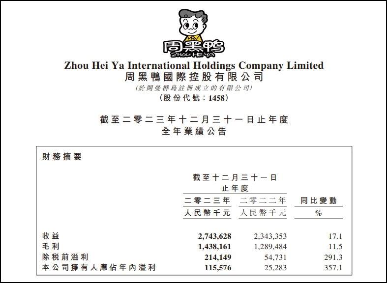 3月27日,周黑鴨發(fā)布2023年度業(yè)績(jī)報(bào)告。報(bào)告顯示,公司總營(yíng)收為人民幣27.4億元,同比增長(zhǎng)17.1%,凈利潤(rùn)為人民幣1.15億元,上年同期為2528.3萬(wàn)元,同比增長(zhǎng)357.1%。2023年,周黑鴨重回增長(zhǎng)軌道,營(yíng)收和凈利潤(rùn)雙雙增長(zhǎng),展現(xiàn)出了強(qiáng)勁的市場(chǎng)競(jìng)爭(zhēng)力和穩(wěn)健的發(fā)展態(tài)勢(shì)。 同時(shí),周黑鴨發(fā)布公告稱(chēng),董事會(huì)擬于自2024年3月28日起至2025年舉行的股東周年大會(huì)結(jié)束期間動(dòng)用最多4億港元,不定期于公開(kāi)市場(chǎng)購(gòu)回本公司股份,數(shù)目不超過(guò)公司于2023年6月6日已發(fā)行股份總數(shù)10%。此舉不僅彰顯了公司對(duì)未來(lái)長(zhǎng)期發(fā)展的信心,也進(jìn)一步體現(xiàn)了周黑鴨對(duì)投資者利益的重視和維護(hù)。 分類(lèi)來(lái)看,其中鴨及鴨副產(chǎn)品的營(yíng)收為21.21億元,營(yíng)收占比為77.3%,其他產(chǎn)品的營(yíng)收為5.87億元,營(yíng)收占比為21.4%。特許經(jīng)營(yíng)費(fèi)為3520.5萬(wàn)元,營(yíng)收占比為1.3%。 2023年,周黑鴨的銷(xiāo)售成本為13.055億元。周黑鴨在交通樞紐渠道積極獲取強(qiáng)勢(shì)點(diǎn)位,截至2023年12月31日,交通樞紐門(mén)店凈增141家,總數(shù)達(dá)319家,創(chuàng)下近三年歷史新高。該公司的零售門(mén)店總數(shù)為3816家,上年同期為3429家。 其中自營(yíng)門(mén)店1720家,特許經(jīng)營(yíng)門(mén)店2096家,覆蓋中國(guó)28個(gè)省、自治區(qū)及直轄市內(nèi)的331個(gè)城市。 截至2023年底,周黑鴨的線上業(yè)務(wù),即傳統(tǒng)電商平臺(tái)、社區(qū)生鮮平臺(tái)及直播等新興電商渠道業(yè)務(wù)收入占總營(yíng)收的14.4%。2023年到店業(yè)務(wù)實(shí)現(xiàn)GMV近8000萬(wàn)元,線上訂單到店核銷(xiāo)率超過(guò)70%。 值得一提的是,2023年,經(jīng)過(guò)對(duì)餐桌鹵副品牌探索,周黑鴨探尋到更符合當(dāng)下消費(fèi)趨勢(shì)、發(fā)展更快的鎖鮮+熱鹵/散鹵二合一的店型模式,目前已在武漢小規(guī)模試點(diǎn)。通過(guò)熱鹵帶來(lái)新客流促使周黑鴨鎖鮮存量與熱鹵增量的同步增長(zhǎng),促進(jìn)店效進(jìn)一步提升。 對(duì)于未來(lái)的展望,周黑鴨在財(cái)報(bào)中表示, 在新的消費(fèi)環(huán)境下,集團(tuán)將探索拓展鎖鮮&熱鹵二合一新店型,進(jìn)一步促進(jìn)店效提升,同時(shí)將持續(xù)堅(jiān)守長(zhǎng)期主義,不斷迎接新的機(jī)遇與挑戰(zhàn)。 |