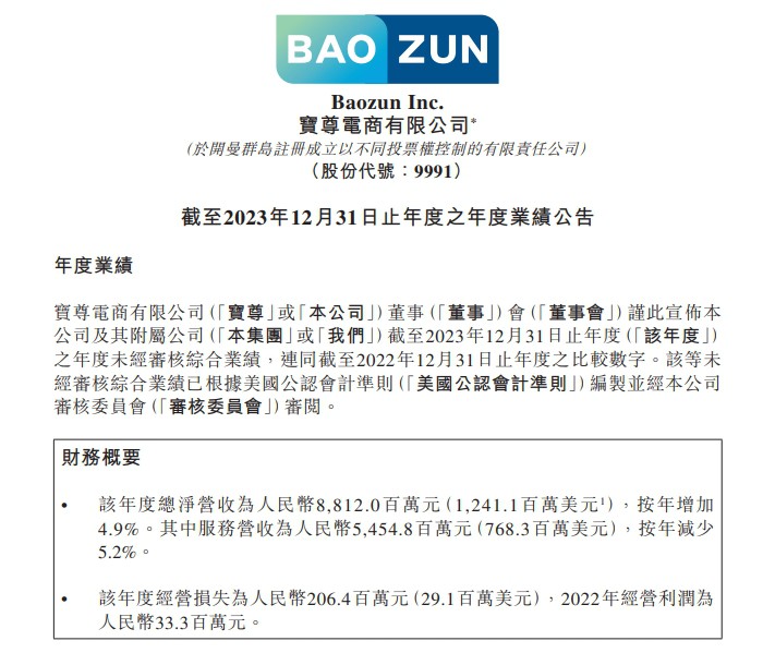3月28日,寶尊電商有限公司公布截至2023年12月31日止年度之年度業(yè)績(jī)。 據(jù)公告,寶尊電商于報(bào)告期內(nèi)的總凈營(yíng)收為88.12億元,按年增加4.9%;年度經(jīng)營(yíng)損失達(dá)2.06億元,歸屬于寶尊普通股股東的凈損失為2.78億元。每股美國(guó)存托股基本及攤薄凈損失為4.68元。 截至2023年12月31日止年度,產(chǎn)品銷售營(yíng)收,包括來(lái)自電商及品牌管理的產(chǎn)品銷售營(yíng)收,分別為20.92億元及12.65億元。服務(wù)營(yíng)收為54.55億元,按年減少5.2%。 |
