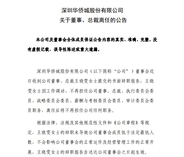 3月29日,深圳華僑城股份有限公司發(fā)布關(guān)于董事、總裁離任的公告。 據(jù)公告,公司董事、總裁王曉雯女士因工作調(diào)動原因,已提交書面辭職報告,將不再擔任公司董事、總裁、執(zhí)行委員會委員、戰(zhàn)略委員會委員、薪酬與考核委員會委員、審計委員會委員職務,離任后將不再擔任公司任何職務。 在總裁空缺期間,副董事長劉鳳喜先生將代行總裁職責。截止公告日,王曉雯女士持有公司股份2,385,174股。(觀點網(wǎng)) |