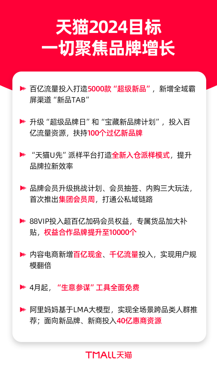 4月2日,TopTalk 2024天貓超級品牌私享會在上海舉行,天貓新一年度的品牌經(jīng)營策略發(fā)布。 據(jù)了解,今年,天貓多維度升級品牌經(jīng)營體系,從新品打造、營銷策略、內(nèi)容電商,到各行各業(yè)的具體商家扶持舉措,都將全面聚焦于全平臺的第一目標——讓品牌商家獲得未來可期的生意增長。行業(yè)一線也將獲得更高的自主決策權,主導更多資源分配,為商家提供確定性資源。 作為品牌營銷和經(jīng)營的第一陣地,2023年全年,天貓誕生了超過4100個億元品牌,超過5000個品牌開店3年內(nèi)成交突破千萬。全球品牌始終將天貓作為新品首發(fā)陣地,眾多新品在天貓上市即打爆,2023年首發(fā)的新品中,成交破百萬的有68.8萬個,其中破億的超過1800個。 新的一年間,天貓將繼續(xù)加大平臺新品策略的資源投入,幫助品牌新品爆發(fā)。與新品相關的資源規(guī)模將提升3倍,在首頁、搜索、推薦等基礎上,新增全域霸屏的“新品tab”,并增加超百億級流量資源,重點打造5000個“超級新品”。天貓還將升級“寶藏新品牌計劃”,扶持100個過億新品牌。 88VIP作為全網(wǎng)最具消費價值的人群,2023年會員人數(shù)規(guī)模大幅提升,會員人數(shù)規(guī)模超過了3200萬。今年,天貓也將新增百億級投入,加碼88VIP會員權益,進一步豐富專屬貨品,加大會員補貼,權益合作品牌規(guī)模從4000個提升至10000個,讓更多品牌實現(xiàn)在高購買力消費者中的生意增長。 面向消費需求進一步細分和場景化購買的趨勢,平臺更重視通過營銷和全域運營手段,為品牌獲取、積淀更多用戶資產(chǎn)。“天貓U先”全渠道派樣平臺將推出全新入倉派樣模式,幫品牌擴大拉新規(guī)模,降低獲客成本。2023年全年,天貓有114個品牌粉絲突破千萬,56個品牌的會員達到千萬,品牌會員成為拉動復購的重要資產(chǎn)。 億邦動力獲悉,此次TopTalk會上,服飾、快速消費品、家享生活、3C數(shù)碼、運動戶外、食品、天貓國際等行業(yè)在平臺橫向資源的基礎上,公布了行業(yè)特色打法舉措與運營策略,為商家長線增長提供更確定的資源。 服飾、快消分別推出了新品打爆計劃。服飾行業(yè)上線“新品速爆計劃”,為有潛力脫穎而出的新品全方位進行免費流量加持,新品啟動周期縮短為7~14天,并能在30天完成打爆,成為行業(yè)爆品?煜袠I(yè)也將全鏈路投入資源,提供更有確定性的流量機制,重點打造20個億級新品,打爆2000個超級新品。 在打造超級單品方面,天貓快消主打商品矩陣分層運營,重點打造次頭部超級單品1000個,讓品牌產(chǎn)品矩陣從“一超”轉(zhuǎn)化為“多強”。為提升品牌長線經(jīng)營效率,天貓快消將升級“日銷+大促”雙核運營體系,新的人群標簽3.0從過去以用戶需求和功效等方面的劃分,到以商品疊加垂直場景的需求劃分,更多洞察結(jié)合內(nèi)容和產(chǎn)品供給、運營手段,為品牌找到新增量點。 去年12月由家裝、家居、家電三大行業(yè)整合而來天貓家享生活,今年將著重打造“家生活”場景,通過AI+3D技術以及直播、短視頻的內(nèi)容導購,為商家提供從單品售賣到跨品類套購。繼續(xù)推動品牌旗艦店與線下門店打通的全域零售,實現(xiàn)線下門店商品在天貓直售。此外,持續(xù)升級供應鏈及服務能力,推出主打一次搞定的“天貓家享服務”,實現(xiàn)全國50座城市大件商品送裝一體、晚到必賠、服務安裝一口價。 “內(nèi)容電商”成為今年眾多行業(yè)運營的關鍵詞。2023年,淘寶內(nèi)容消費用戶規(guī)模同比增長達到44%,月成交破百萬的直播間達1.2萬個。去年12月淘寶內(nèi)容電商事業(yè)部成立,打通短視頻、達播、店播、圖文與店鋪經(jīng)營,形成離貨架最近的內(nèi)容電商生態(tài)。 億邦動力獲悉,今年,淘寶內(nèi)容電商將新增百億現(xiàn)金、千億流量投入,來實現(xiàn)用戶規(guī)模同比增長100%的目標,和品牌商家分享翻倍增長的新紅利。此外,天貓服飾行業(yè)追加投入10億級平臺資源,孵化優(yōu)質(zhì)內(nèi)容直播間、垂類達人等,提升品牌內(nèi)容滲透率。快消行業(yè)則為品牌商家提供店播免傭激勵,并推出流量激勵政策,各個發(fā)展階段的商家均可參與。 天貓全面升級品牌經(jīng)營體系,以商家增長為第一目標采取的各項投入和舉措,將為商家精細化人貨場運營、尋找新的增長點帶來更大的確定性。在新機制下,天貓平臺投入的多項超百億級資源,將為商家?guī)砀珳实男芴嵘P袠I(yè)“定制”的各項新舉措,也將幫助品牌鎖定人群、捕捉趨勢,打造爆款商品,實現(xiàn)長期持續(xù)增長。 |