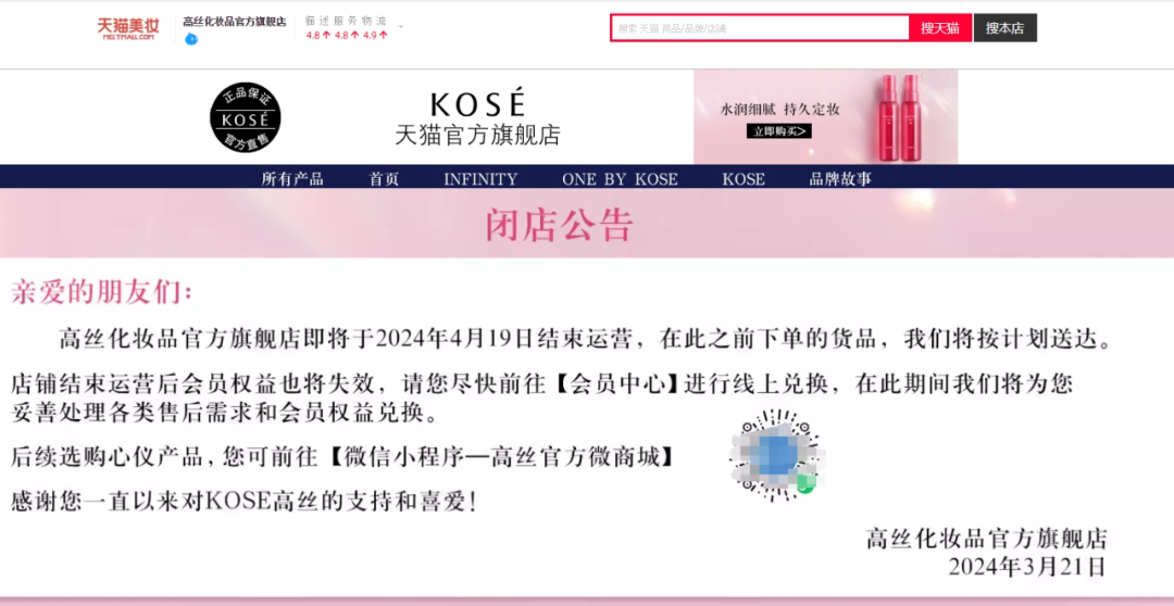 近日,高絲天貓旗艦店的閉店公告稱,“即將于2024年4月19日結(jié)束運營,在此之前下單的貨品,我們將按計劃送達(dá)。店鋪結(jié)束運營后會員權(quán)益也將失效,請您盡快前往會員中心進(jìn)行線上兌換! 記者也咨詢了天貓客服,回復(fù)是,“高絲將調(diào)整業(yè)務(wù)規(guī)模和發(fā)展重點,您可繼續(xù)前往高絲線下店鋪或微信小程序——高絲官方微商城購買產(chǎn)品。問起天貓店鋪是否有希望恢復(fù)營業(yè),客服表示具體沒有接到相關(guān)通知! 據(jù)界面新聞報道,高絲集團表示,此次渠道關(guān)閉為戰(zhàn)略性調(diào)整,目前暫無其他新計劃。實際上,除了天貓旗艦店,高絲官方在線商城早在2023年8月31日已經(jīng)關(guān)閉。 從店鋪信息來看,高絲天貓旗艦店運營方為高絲化妝品銷售(中國)有限公司,系日妝集團高絲于中國設(shè)立的獨資公司。 該旗艦店顯示,店內(nèi)共有三大品牌產(chǎn)品在售,分別為高絲茵菲妮、高絲蘊一以及高絲MAKE KEEP MIST品牌,店鋪SKU約38個,護(hù)膚、彩妝類產(chǎn)品均有售賣,產(chǎn)品單價在55~3150元不等。 目前,店鋪內(nèi)銷量最高的為高絲MAKE KEEP MIST定妝噴霧,累計售出6萬+件,其余產(chǎn)品銷量則在幾十到幾百不等。從店鋪在售商品看,其原價178元一瓶的定妝噴霧,目前券后89元買一贈一,目前顯示已售出超1萬單。 據(jù)悉,高絲是日本一家以化妝品制造與銷售為主的企業(yè),初期以代理美容化妝品牌為主,1948年開始發(fā)展自有品牌,目前集團旗下共擁有KOSE高絲、COSMEDECORTE黛珂、雪肌精等多個品牌。 據(jù)現(xiàn)代快報報道,4月7日,記者走訪市場了解到,目前實體店極少售賣高絲的相關(guān)產(chǎn)品,基本上只能通過電商平臺進(jìn)行購買。 |