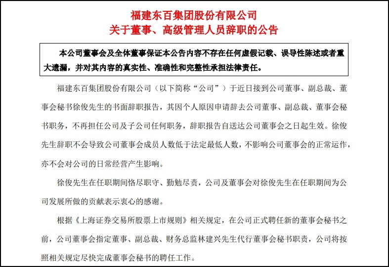 4月16日,福建東百集團(tuán)股份有限公司宣布,公司董事、副總裁及董事會(huì)秘書徐俊因個(gè)人原因辭職,該辭職報(bào)告自送達(dá)公司董事會(huì)之日起生效。 公告指出,徐俊在東百集團(tuán)擔(dān)任的職務(wù)包括公司董事、副總裁及董事會(huì)秘書,其辭職不會(huì)影響公司董事會(huì)成員人數(shù)低于法定最低人數(shù),也不會(huì)對(duì)公司董事會(huì)的正常運(yùn)作及日常經(jīng)營(yíng)產(chǎn)生影響。 為保證公司治理結(jié)構(gòu)的穩(wěn)定和公司運(yùn)營(yíng)的連續(xù)性,東百集團(tuán)已安排董事、副總裁、財(cái)務(wù)總監(jiān)林建興代行董事會(huì)秘書職責(zé)。公司表示,將按照相關(guān)規(guī)定盡快完成董事會(huì)秘書的聘任工作,以確保公司治理結(jié)構(gòu)的完整性和高效運(yùn)作。 此前東百集團(tuán)披露2023年年報(bào)顯示,實(shí)現(xiàn)營(yíng)業(yè)收入18.86億元,同比增長(zhǎng)12.84%;歸母凈利潤(rùn)3504.54萬(wàn)元,同比增長(zhǎng)60.89%;扣非歸母凈利潤(rùn)1.03億元,同比增長(zhǎng)192.28%。截至報(bào)告期末,公司累計(jì)獲取18個(gè)物流項(xiàng)目,合計(jì)建筑面積約180萬(wàn)平方米,土地面積約202萬(wàn)平方米。 |