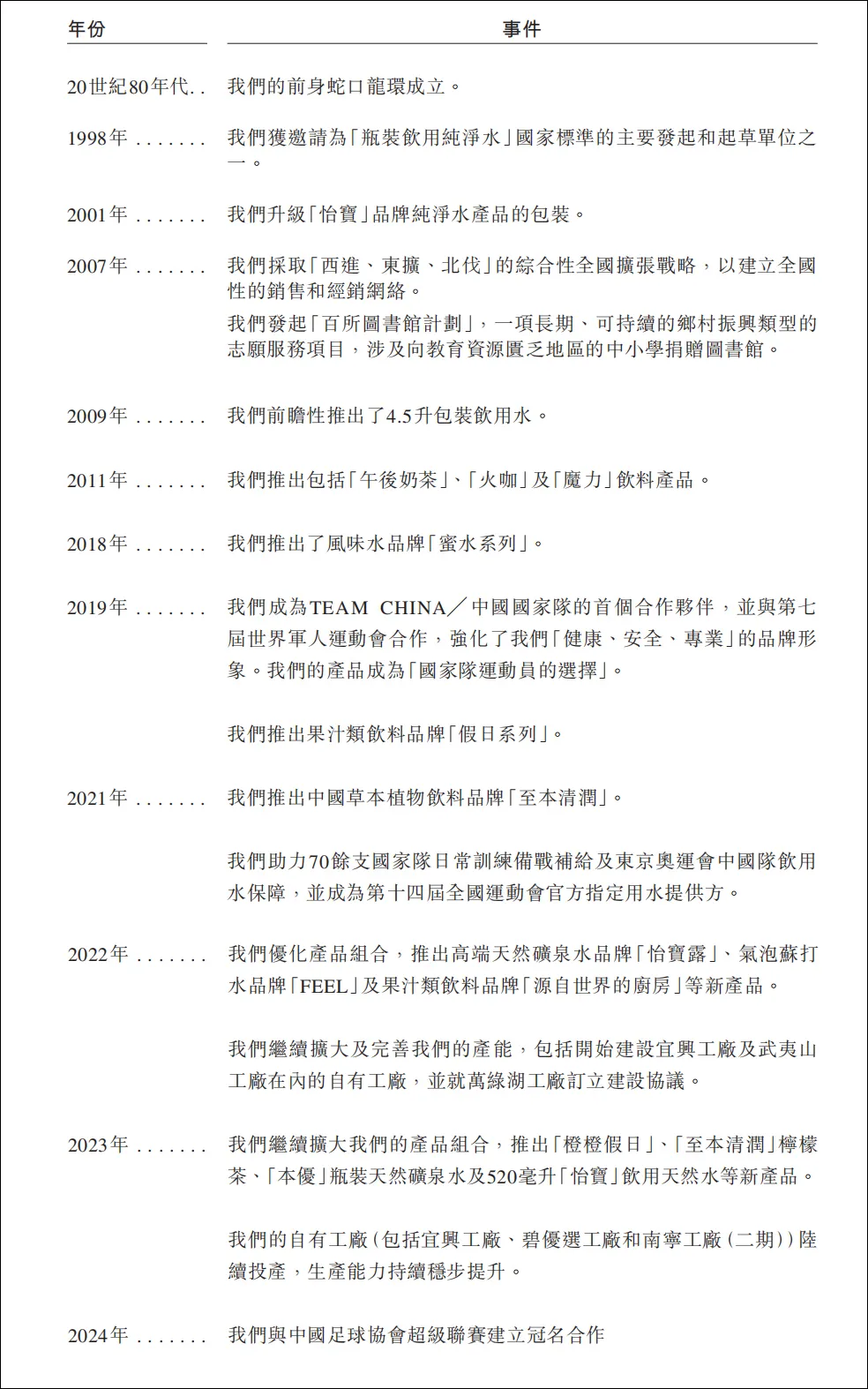 來源 | 食業(yè)家(shiyehome) 近年來,關(guān)于華潤集團(tuán)籌劃華潤怡寶在香港IPO的傳聞不斷,而今此事終于得以確認(rèn)。 據(jù)港交所4月22日披露,華潤飲料(控股)有限公司(下稱:華潤飲料)向港交所主板提交上市申請,bofa securities、中銀國際、中信證券、瑞銀集團(tuán)為其聯(lián)席保薦人。 01 年?duì)I收135億,凈利潤13.31億 財(cái)務(wù)方面,于2021年度、2022年度及2023年度,華潤飲料實(shí)現(xiàn)收入分別約為113.40億元、126.23億元及135.15億元,三年的年均復(fù)合增長率為9.2%;年內(nèi)利潤分別約為8.58億元、9.89億元及13.31億元,三年的年均復(fù)合增長率為24.6%。 分品類來看,于2021年度、2022年度及2023年度,華潤飲料包裝飲用水產(chǎn)品實(shí)現(xiàn)收入分別約為108.18億元、119.06億元及124.47億元;其他飲料產(chǎn)品實(shí)現(xiàn)收入分別為5.22億元、7.17億元及13.51億元。 截至當(dāng)下,華潤飲料主要擁有“怡寶”、“至本清潤”、“蜜水系列”、“假日系列”及“佐味茶事”等13個(gè)品牌的產(chǎn)品組合、共計(jì)56個(gè)SKU。公司多樣化的產(chǎn)品組合覆蓋中國即飲軟飲市場的核心品類,如包裝飲用水、茶飲料及果汁類飲料等,不斷夯實(shí)“一超多強(qiáng)”的多品類戰(zhàn)略發(fā)展格局。 根據(jù)灼識咨詢報(bào)告,華潤飲料在茶飲料、果汁類飲料、咖啡飲料等核心即飲軟飲品類的市場份額均居于中國市場前十位;特別地,華潤飲料在中國菊花茶飲料市場排名第一,以及在風(fēng)味水市場排名第二。 02 怡寶瓶裝水年銷146億瓶 招股書中,華潤飲料引述灼識咨詢報(bào)告顯示,華潤飲料是中國最早專業(yè)化生產(chǎn)包裝飲用水的企業(yè)之一。 2023年,華潤飲料售出逾146億瓶「怡寶」品牌水產(chǎn)品。 根據(jù)灼識咨詢報(bào)告,華潤飲料的“怡寶”品牌飲用純凈水產(chǎn)品于2023年的零售額達(dá)到了人民幣395億元,是中國飲用純凈水市場的第一品牌。2023年,華潤飲料在包裝飲用水市場及飲用純凈水市場的市場份額分別為18.4%及32.7%。 (2023年中國包裝飲用水市場前五大公司,根據(jù)資料推測,分別為農(nóng)夫山泉、華潤飲料、景田、娃哈哈和康師傅) 中國包裝飲用水市場的集中度不斷提高,按零售額計(jì),前五大企業(yè)的總市場份額由2021年的56.2%增至2023年的58.6%。根據(jù)灼識咨詢報(bào)告,按零售額計(jì),華潤飲料在2023年中國包裝飲用水市場排名第二,在中國飲用純凈水市場排名第一。 根據(jù)灼識咨詢報(bào)告,按零售額計(jì),飲用純凈水是包裝飲用水市場中規(guī)模最大的細(xì)分市場,中國包裝飲用水市場占比為56.1%;按復(fù)合年增長率計(jì),飲用純凈水亦是中國包裝飲用水市場中增長最快的細(xì)分市場,2018至2023年的復(fù)合年增長率為7.7%,并預(yù)計(jì)在2023年至2028年加速至8.3%,按零售額計(jì)2028年中國包裝飲用水市場占比將提升至57.2%。 03 百億怡寶的新征程 公開信息顯示,華潤飲料前身是1984年成立的中國龍環(huán)(蛇口)有限公司,當(dāng)時(shí)主打“刺梨汁”這類果汁飲品。 1990年,該公司首次推出“怡寶牌”純凈水,成為國內(nèi)最早專業(yè)化生產(chǎn)包裝飲用水的企業(yè)之一。 1990年,龍環(huán)公司在國內(nèi)率先推出“怡寶”牌蒸餾水 1996年,華潤飲料與蛇口供水就運(yùn)營怡寶中國訂立合作協(xié)議,據(jù)此華潤飲料及蛇口供水分別持有怡寶中國67.25%及32.75%的股權(quán),而蛇口龍環(huán)的業(yè)務(wù)隨后由怡寶中國承繼。 1999年,華潤飲料收購蛇口供水持有的怡寶中國余下32.75%股權(quán),據(jù)此怡寶中國成為華潤飲料的全資子公司。 2001年怡寶全面更換新包裝,啟用了一直沿用至今的新包裝。 此后的數(shù)年間,華潤飲料踏踏實(shí)實(shí)地做著“水”的事業(yè)。怡寶從最初的幾千萬的營業(yè)額到2007年第一次突破了10億元大關(guān),達(dá)到13億元。憑借穩(wěn)扎穩(wěn)打的策略,華潤飲料已發(fā)展成為我國第二大包裝飲用水企業(yè)及最大的飲用純凈水生產(chǎn)企業(yè)。 值得注意的是,華潤怡寶也在積極尋找“第二曲線”。近兩年,華潤飲料陸續(xù)推出了佐味茶事綠茶、海鹽荔枝、高端水怡寶露、FEEL蘇打氣泡水等新品,進(jìn)一步拓展飲料產(chǎn)品線、多品類共同發(fā)展成為華潤怡寶下一階段的關(guān)鍵發(fā)展戰(zhàn)略,為其邁向下一個(gè)百億元目標(biāo)奠定堅(jiān)實(shí)基礎(chǔ)。 |