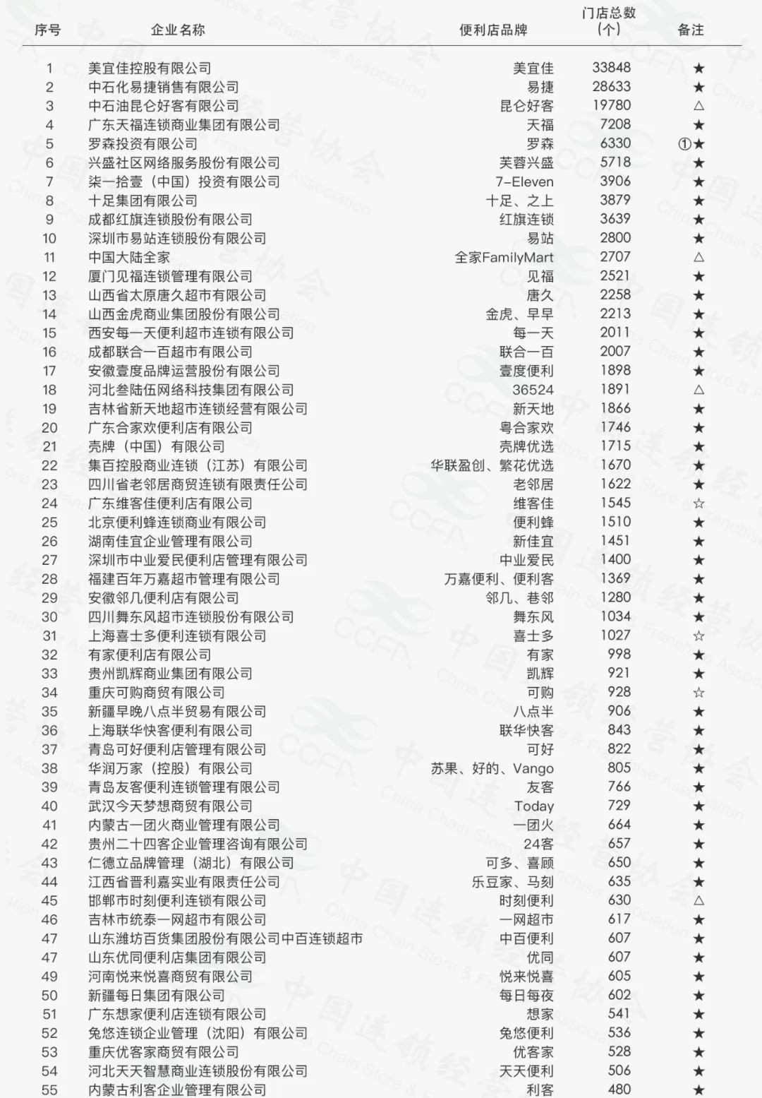 4月23日,中國連鎖經(jīng)營協(xié)會發(fā)布了“2023中國便利店TOP100”榜單(公示時間為2024年4月23日-30日)。 榜單顯示,美宜佳位居第一位,門店數(shù)達(dá)33848家;中石化易捷位居第二位,門店數(shù)達(dá)28633家;中石油昆侖好客位列第三位,門店數(shù)達(dá)19780家。天福和羅森分別以7208家和6330家位列第四和第五。 此外,7-11、十足、紅旗連鎖、易站進(jìn)入前10位,門店數(shù)量分別為3906家、3879家、3639家和2800家。 全家跌出前10,以2707家門店的規(guī)模,位居第11位;緊隨其后的見福、唐久、金虎和每一天進(jìn)入前15位,門店數(shù)均在2000家以上。 外資便利店中,羅森以6330家門店居首,其次是7-ELEVEN和全家。 |
