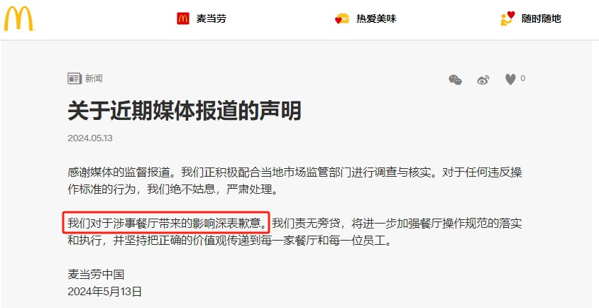 5月13日晚,麥當(dāng)勞中國(guó)發(fā)布《關(guān)于近期媒體報(bào)道的聲明》稱(chēng),感謝媒體的監(jiān)督報(bào)道。正積極配合當(dāng)?shù)厥袌?chǎng)監(jiān)管部門(mén)進(jìn)行調(diào)查與核實(shí)。對(duì)于任何違反操作標(biāo)準(zhǔn)的行為,絕不姑息,嚴(yán)肅處理。 麥當(dāng)勞表示,對(duì)于涉事餐廳帶來(lái)的影響深表歉意。將進(jìn)一步加強(qiáng)餐廳操作規(guī)范的落實(shí)和執(zhí)行,并堅(jiān)持把正確的價(jià)值觀傳遞到每一家餐廳和每一位員工。 據(jù)新京報(bào)報(bào)道,近期,記者先后臥底麥當(dāng)勞鄭州卓越農(nóng)聯(lián)餐廳和麥當(dāng)勞濟(jì)南大學(xué)餐廳,發(fā)現(xiàn)兩家餐廳均存在篡改食品保質(zhì)期標(biāo)簽、使用過(guò)期食材、食物過(guò)了保存期依舊售賣(mài)以及偷工減料等問(wèn)題。麥當(dāng)勞鄭州卓越農(nóng)聯(lián)餐廳還存在炸油品質(zhì)超標(biāo)的情況。 |