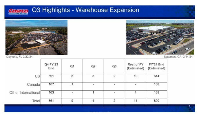 5月30日,Costco開市客公布了截至2024年5月12日的2024財(cái)年第三季度(12周)及前36周的經(jīng)營業(yè)績。 數(shù)據(jù)顯示,三季度凈銷售額為573.9億美元,同比增長9.1%。凈利潤為16.8億美元,同比增長約29%,攤薄后每股收益3.78美元。會(huì)員方面,付費(fèi)會(huì)員人數(shù)為7450萬,同比增長7.8%,總持卡人數(shù)為1.339億,同比增長7.4%。其中,全球會(huì)員續(xù)費(fèi)率為90.5%,北美續(xù)費(fèi)率93%。電子商務(wù)方面,可比銷售額同比增長20.7%,APP下載量增長32%,網(wǎng)站流量增長16%。平均訂單價(jià)值增長8%。Costco物流配送增長28%,并且正在推進(jìn)在線購買并在賣場提貨試點(diǎn)項(xiàng)目。 前36周凈銷售額為1714.4億美元,同比增長7.0%。前36周的凈收入為50.1億美元,攤薄后每股收益11.27美元,去年同期為41.3億美元,攤薄后每股收益9.30美元。 Costco目前擁有878家門店,其中中國臺(tái)灣14個(gè),中國大陸7個(gè)。其還在美國、加拿大、英國、墨西哥、韓國、中國臺(tái)灣、日本和澳大利亞經(jīng)營電子商務(wù)網(wǎng)站。展望2024財(cái)年剩余時(shí)間,Costco計(jì)劃在美國新開10家門店,計(jì)劃在全球市場新開4家門店。 |