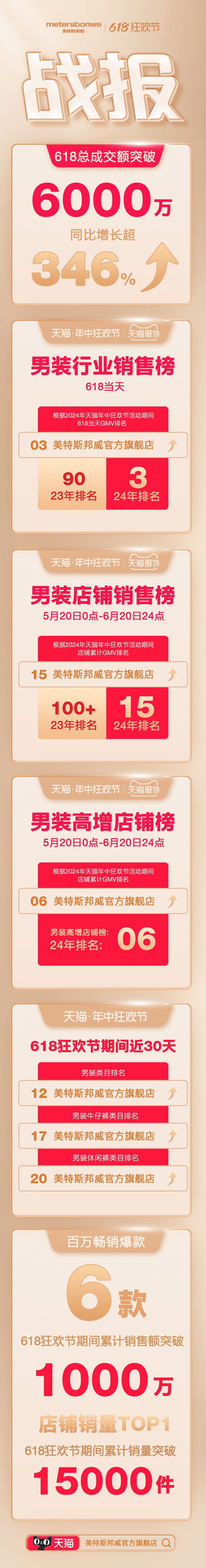 2024年618大促顯示,今年618大促期間美特斯邦威渠道GMV突破6000萬元,618當(dāng)天,排名第3名,同比增長346%。618狂歡節(jié)期間整體排名同比去年提高了118名,排名15名。男裝類目排名第十二,6款產(chǎn)品累計銷售額突破1000萬。 本次在天貓平臺取得的優(yōu)異成績,離不開美特斯邦威最近本地生活的大熱,也顯示消費(fèi)者對于其產(chǎn)品和品牌的認(rèn)可。4月22日以來,在短短一個多月的時間里,美特斯邦威在抖音本地生活業(yè)務(wù)領(lǐng)域的GMV,已經(jīng)突破了1億元大關(guān)。 值得一提的是,美特斯邦威在5.0新零售模式策略賦能下,借助本地生活業(yè)務(wù)場景,拉齊傳統(tǒng)門店零售專業(yè)、搜索貨架電商、社交電商、內(nèi)容電商等全域零售專業(yè)能力,形成全新閉環(huán)的新零售商業(yè)模式。得益于在電商的投入,美邦服飾在618期間線上銷量顯著提升。 |
