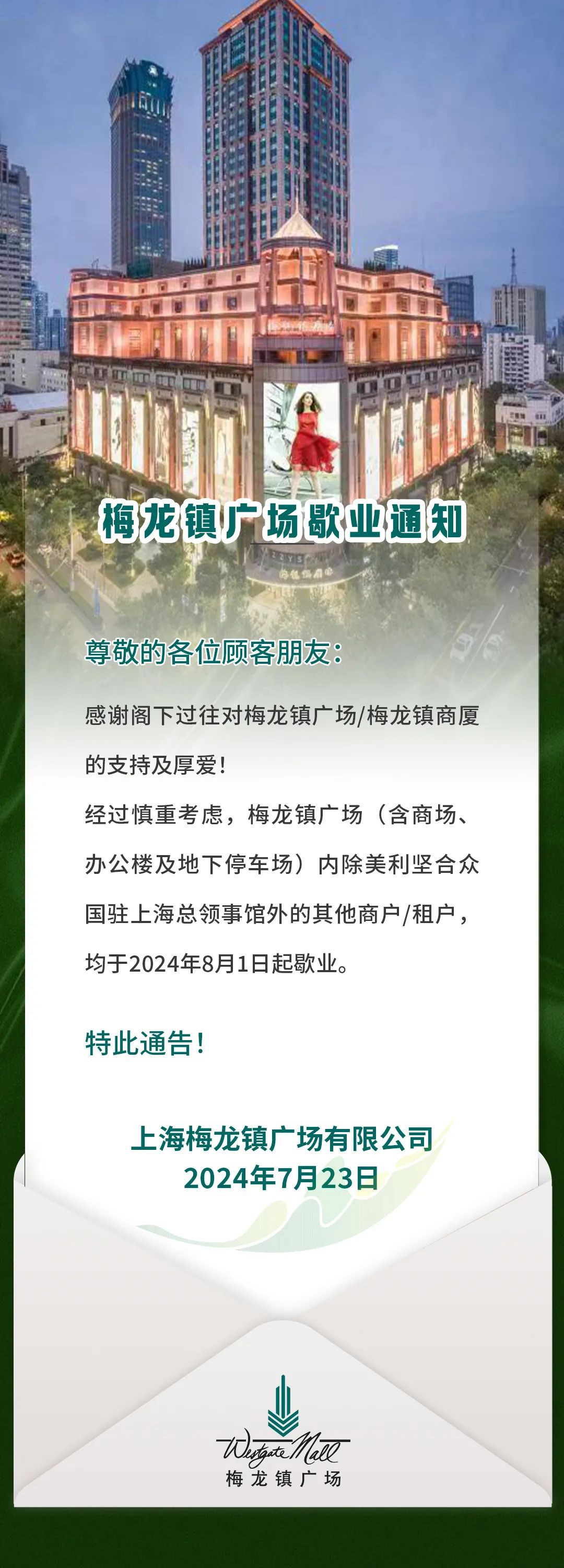 2024年7月23日獲悉,梅龍鎮(zhèn)廣場(chǎng)將于2024年8月1日停業(yè),進(jìn)行為期3年的調(diào)整改造。 坐落于南京西路1038號(hào)的梅龍鎮(zhèn)廣場(chǎng),地處上海頂級(jí)商圈,與恒隆廣場(chǎng)、中信泰富一起組成“梅泰恒金三角”,既是上海高端商場(chǎng)的代表之一,也是許多年輕一代上海人的童年回憶。 梅龍鎮(zhèn)廣場(chǎng)于1998年投入使用,歷經(jīng)26年,商場(chǎng)設(shè)施設(shè)備存在老化,內(nèi)部功能布局已無(wú)法滿足現(xiàn)代高端商務(wù)商業(yè)發(fā)展及其需求,亟需更新升級(jí)。 據(jù)介紹,改造完成后,梅龍鎮(zhèn)廣場(chǎng)將通過(guò)提升綜合商業(yè)業(yè)態(tài)與品質(zhì)、拓展城市公共空間與綜合功能,為廣大市民提供更加多元化的體驗(yàn),為城市更新注入新的活力,為南京西路商圈增添標(biāo)志性新地標(biāo)。 |