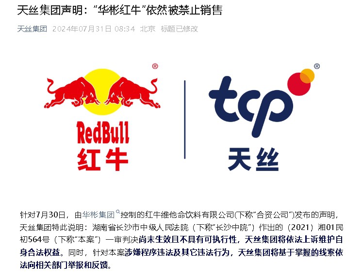 8月1日消息,天絲集團(tuán)發(fā)布聲明稱,“華彬紅!币廊槐唤逛N售。 以下為聲明原文: 針對(duì)7月30日,由華彬集團(tuán)控制的紅牛維他命飲料有限公司(下稱“合資公司”)發(fā)布的聲明,天絲集團(tuán)特此說(shuō)明:湖南省長(zhǎng)沙市中級(jí)人民法院(下稱“長(zhǎng)沙中院”)作出的(2021)湘01民初564號(hào)(下稱“本案”)一審判決尚未生效且不具有可執(zhí)行性,天絲集團(tuán)將依法上訴維護(hù)自身合法權(quán)益。同時(shí),針對(duì)本案涉嫌程序違法及其它違法行為,天絲集團(tuán)將基于掌握的線索依法向相關(guān)部門(mén)舉報(bào)和反饋。 2020年12月,最高人民法院(下稱“最高院”)(2020)最高法民終394號(hào)終審生效判決已明確確認(rèn)“紅牛”系列商標(biāo)為天絲集團(tuán)所有,天絲集團(tuán)對(duì)紅牛維他命飲料有限公司的商標(biāo)使用許可已于2016年10月6日到期,“紅牛”商標(biāo)權(quán)屬穩(wěn)定且清晰。 本案被告長(zhǎng)沙市華廈糖酒有限公司(下稱“華廈公司”)是華彬集團(tuán)在湖南省最大的經(jīng)銷商。天絲集團(tuán)于2021年5月起訴并申請(qǐng)行為保全,長(zhǎng)沙中院于當(dāng)月作出行為保全裁定,要求華廈公司立即停止銷售侵權(quán)紅牛產(chǎn)品,直至本案生效判決執(zhí)行。2021年6月15日,華廈公司不服該保全裁定,向長(zhǎng)沙中院提起復(fù)議,2023年6月12日,長(zhǎng)沙中院依法駁回其復(fù)議申請(qǐng)。目前該行為保全仍然屬于生效狀態(tài),華廈公司目前仍然被禁止銷售“紅牛維生素功能飲料”。 本案自立案后3年一直未開(kāi)庭,而權(quán)利人天絲集團(tuán)同期向其他多地中級(jí)人民法院提起的類似侵權(quán)案件,一審法院均已一致宣判認(rèn)定銷售商銷售“紅牛維生素功能飲料”的行為構(gòu)成商標(biāo)侵權(quán),相關(guān)案件已進(jìn)入二審程序,甚至部分案件判決已經(jīng)生效,而本案拖延至2024年3月11日才開(kāi)庭審理。后長(zhǎng)沙中院于2024年5月14日以需要以另案審理結(jié)果為依據(jù)裁定中止審理;2024年7月26日,長(zhǎng)沙中院突然以本案出現(xiàn)了新的證據(jù)和事實(shí),又可以不以另一案的審理為依據(jù),恢復(fù)案件審理;直到7月29日,在沒(méi)有出現(xiàn)任何新的判決、新的事實(shí)和證據(jù)的情況下,突然作出一審判決。除3年不開(kāi)庭的重大程序異常外,在過(guò)去的半年里長(zhǎng)沙中院作出一系列反常裁定,在不聽(tīng)取權(quán)利人意見(jiàn)的情況下草率的恢復(fù)審理,并在恢復(fù)審理后的3日內(nèi)審理結(jié)案涉嫌程序違法。 此外,該判決存在對(duì)最高院生效裁定認(rèn)定事實(shí)描述進(jìn)行誤導(dǎo)性加工篡改、選擇性忽視我方證據(jù)等嚴(yán)重違法情形,天絲集團(tuán)將形成書(shū)面報(bào)告于近日依法向有關(guān)部門(mén)提交。 2021年以來(lái),浙江高院、吉林高院、黑龍江高院及全國(guó)多地法院針對(duì)華彬集團(tuán)及其上下游關(guān)聯(lián)方的侵權(quán)行為作出一審判決,一致認(rèn)定相關(guān)被告侵犯天絲集團(tuán)紅牛商標(biāo)專用權(quán),同時(shí)一例判決已生效,累計(jì)判賠金額已近6億元。2024年6月,針對(duì)合資公司、華彬工廠的商標(biāo)侵權(quán)訴訟二審在最高人民法院均已完成開(kāi)庭,目前已進(jìn)入宣判前的最后階段。而本案一審判決存完全與上述判決和最高院生效判決矛盾,與中國(guó)政府提倡的平等保護(hù)在華投資外商合法權(quán)益背道而馳。就任何侵犯“紅!鄙虡(biāo)專用權(quán)的行為,天絲集團(tuán)將采取一切法律手段,維護(hù)自身合法權(quán)益,絕不向不法勢(shì)力讓步。 |