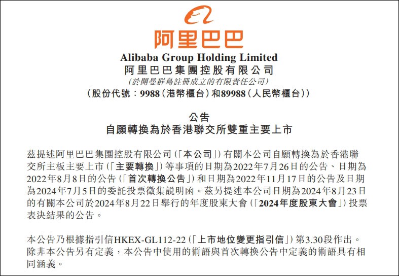 8月23日早間,阿里巴巴在港交所發(fā)布公告稱,自愿轉(zhuǎn)換為于香港聯(lián)交所雙重主要上市。 阿里巴巴在公告中表示,公司于香港聯(lián)交所第二上市變更為主要上市的轉(zhuǎn)換將于2024年8月28日生效。于生效日期,公司將于香港聯(lián)交所及紐交所雙重主要上市,且股票標(biāo)記“S”將自公司于香港聯(lián)交所港幣及人民幣柜臺(tái)的股票簡(jiǎn)稱中刪除。此次自愿轉(zhuǎn)換為雙重主要上市,并不涉及公司的新股發(fā)行和融資。此外,阿里巴巴股東大會(huì)批準(zhǔn)委聘普華永道中天和羅兵咸永道為會(huì)計(jì)師事務(wù)所。 8月15日,阿里巴巴發(fā)布截至2024年6月30日的2025財(cái)年第一季度(自然年2024年第二季度)業(yè)績(jī)。該季度,阿里巴巴收入為2432.36億元人民幣,同比增長(zhǎng)4%;經(jīng)營(yíng)利潤(rùn)為359.89億元人民幣,同比下降15%;經(jīng)調(diào)整EBITA為450.35億元,同比下降1%;歸屬于普通股股東凈利潤(rùn)為242.69億元;凈利潤(rùn)為240.22億元,同比下降27%,主要由于經(jīng)營(yíng)利潤(rùn)下降以及投資減值增加。 阿里巴巴集團(tuán)CEO吳泳銘在財(cái)報(bào)分析師電話會(huì)上稱,預(yù)估阿里巴巴大部分業(yè)務(wù)將會(huì)在1-2年內(nèi)陸續(xù)實(shí)現(xiàn)盈虧平衡。 在此次財(cái)報(bào)分析師會(huì)議上,阿里巴巴集團(tuán)首席財(cái)務(wù)官徐宏表示,阿里正在尋求港交所主要上市轉(zhuǎn)換,公司于8月22日召開(kāi)的股東大會(huì)中會(huì)有相關(guān)提案,經(jīng)股東大會(huì)批準(zhǔn)后,預(yù)計(jì)于8月底可以完成港交所主要上市轉(zhuǎn)換。徐宏提到,至于之后是否接入港股通,還需履行各個(gè)交易所不同規(guī)則下的程序,按照程序來(lái)做應(yīng)該可以實(shí)現(xiàn)。 2022年7月,阿里巴巴發(fā)布公告表示,將會(huì)申請(qǐng)香港為主要上市地。中金公司認(rèn)為,考慮到公司早已滿足納入港股通的其他要求,若公司于2024年8月底成功完成雙重主要上市轉(zhuǎn)換,仍有望趕上9月5日的港股通考察日,并在本輪9月9日調(diào)整附近納入。 |