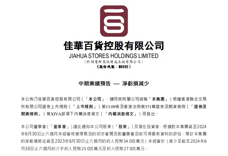 8月22日,佳華百貨控股有限公司發(fā)布中期業(yè)績預告,預計集團的凈虧損將從截至2023年6月30日止六個月的約3400萬元(未經(jīng)審計)減少至截至2024年6月30日止六個月的介乎約2300萬元至約2700萬元。 公告稱,集團的預期凈虧損減少,主要是由于深圳沙井佳漾匯購物中心于2023年7月開業(yè)的影響。其他因素方面,包括但不限于i)來自網(wǎng)上電商的持續(xù)競爭,ii)實體零售競爭激烈,iii)工廠關(guān)閉和失業(yè)率上升令社區(qū)消費習慣普遍下降,以及iv)外商撤資而關(guān)閉工廠使常住人口減少等,對集團的業(yè)務仍有負面影響。 |