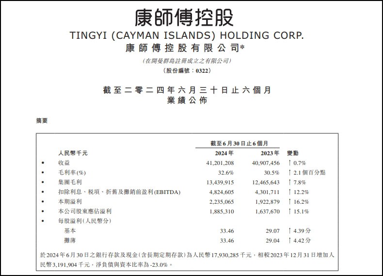 8月26日,康師傅發(fā)布2024上半年財報。 康師傅上半年營收412.01億元,同比增長0.7%;公司股東應占溢利18.85億元,同比增長15.1%;毛利率32.6%,上年同期30.5%。 康師傅表示,2024年上半年,中國經(jīng)濟總體平穩(wěn)運行。消費者關注產(chǎn)質量價比,購物渠道發(fā)生轉移,帶動倉儲會員店、折扣店、興趣電商等渠道的增長。擁有強大的產(chǎn)品力、品牌力、渠道掌控力的企業(yè),可以更好適應變化,服務消費者,從而帶動業(yè)績增長。 具體業(yè)務方面,康師傅上半年方便面業(yè)務收益138.14億元,較上年同期少賣1.36億元,同比下降1%,但依然是公司主要收入來源之一,占集團總收益33.5%。 飲品業(yè)務表現(xiàn)強勁收益達270.6億元,同比增長1.7%,占集團總收益65.7%。其他業(yè)務方面收益達3.22億元,同比下降8.3%,占集團總收益0.8%。 展望下半年,康師傅在財報中表示,預計2024年下半年,內需仍是經(jīng)濟增長的關鍵驅動力。將積極拓展消費場景及售點覆蓋,多舉措激發(fā)目標人群的消費活力。方便面事業(yè)繼續(xù)推出不同規(guī)格、價格和口味的產(chǎn)品服務消費者,并持續(xù)推動行業(yè)整體規(guī)模擴大。飲品事業(yè)加速建立規(guī)模優(yōu)勢,聚焦核心產(chǎn)品,擴展創(chuàng)新產(chǎn)品,滿足消費者不同場景需求,促進銷售增長。 |