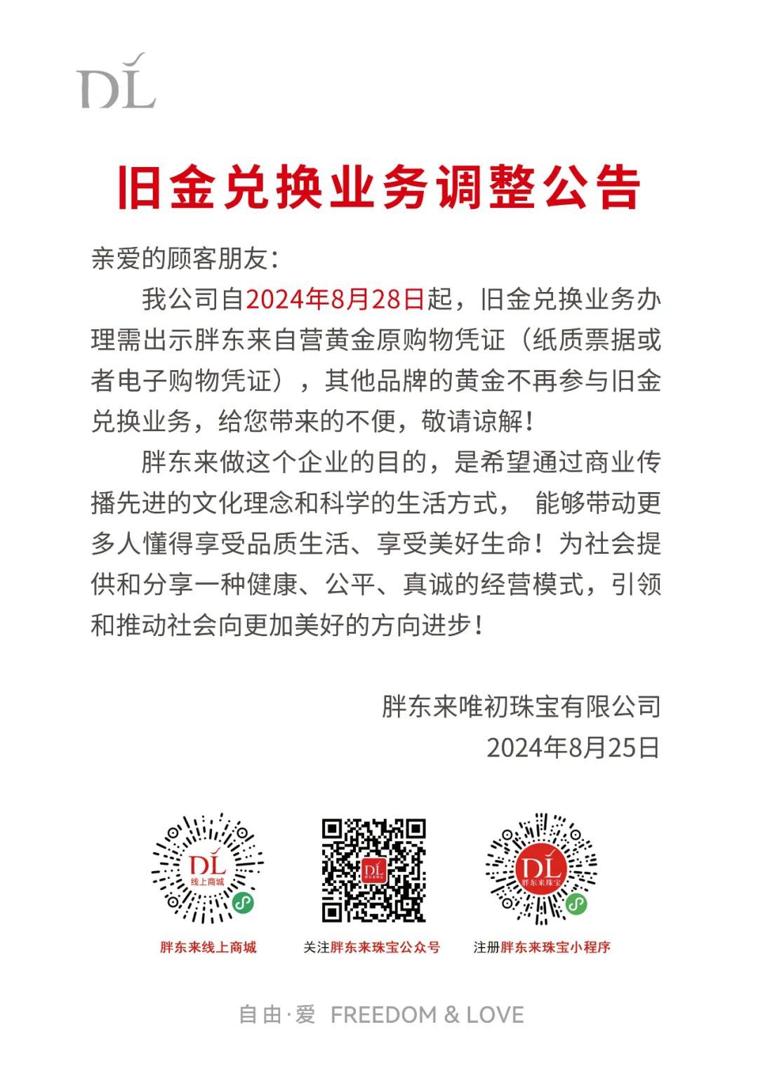 《職業(yè)零售網(wǎng)》獲悉,8月27日,胖東來唯初珠寶官方公眾號發(fā)布一則《舊金兌換業(yè)務調(diào)整公告》。 公告表示,胖東來珠寶自2024年8月28日起,日金兌換業(yè)務辦理需出示胖東來自營黃金原購物憑證(紙質(zhì)票據(jù)或者電子購物憑證),其他品牌的黃金不再參與舊金兌換業(yè)務,給您帶來的不便,敬請諒解! |