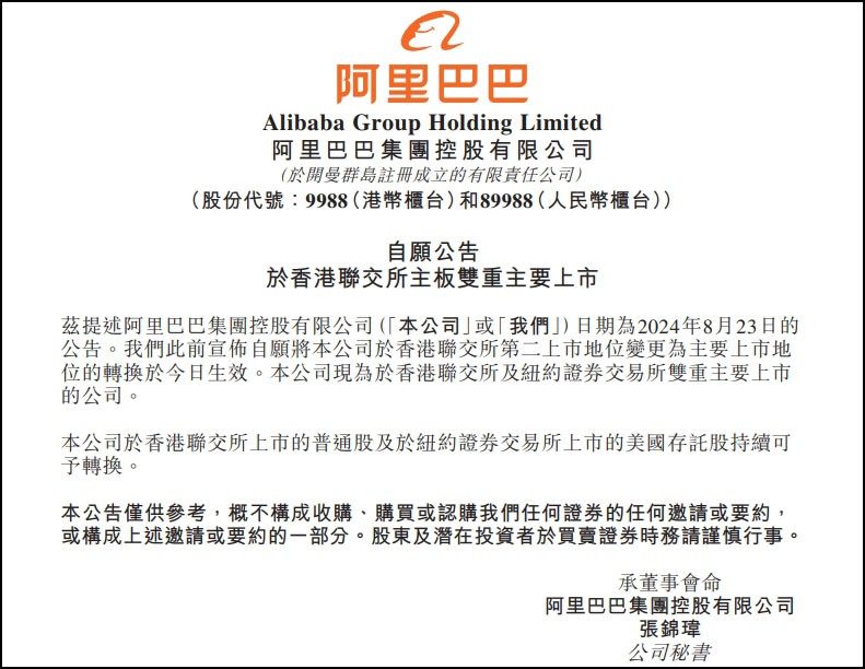 8月28日,阿里巴巴集團發(fā)布公告,正式完成香港雙重主要上市,成為在港交所和紐交所雙重主要上市的公司,公司發(fā)展迎來新的里程碑時刻。 阿里巴巴曾在今年5月份發(fā)布2024財年年報時透露,預計于2024年8月底完成香港主要上市轉換。 完成轉換后,阿里巴巴將在香港聯交所主板及紐約證券交易所兩地雙重主要上市。 就在上周,阿里巴巴集團發(fā)布公告稱,新增香港為主要上市地,將于8月28日在香港聯交所主板主要上市,成為在港交所、紐交所雙重主要上市的公司。如今,已順利完成此項行動。 8月15日晚,阿里巴巴集團公布2025財年第一季度業(yè)績。這也是進入新財年之后,阿里巴巴披露的首份財報。財務數據顯示,阿里巴巴該季度營收2432.4億元,上年同期營收2341.56億元,同比增4%;經調整EBITA利潤450.35億元。 |