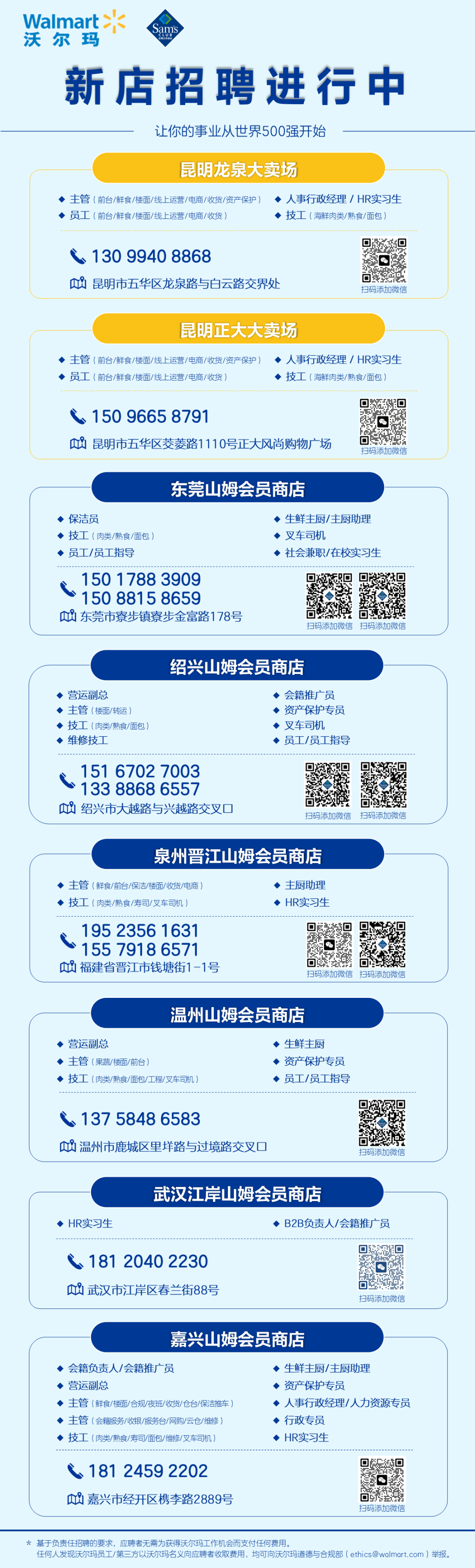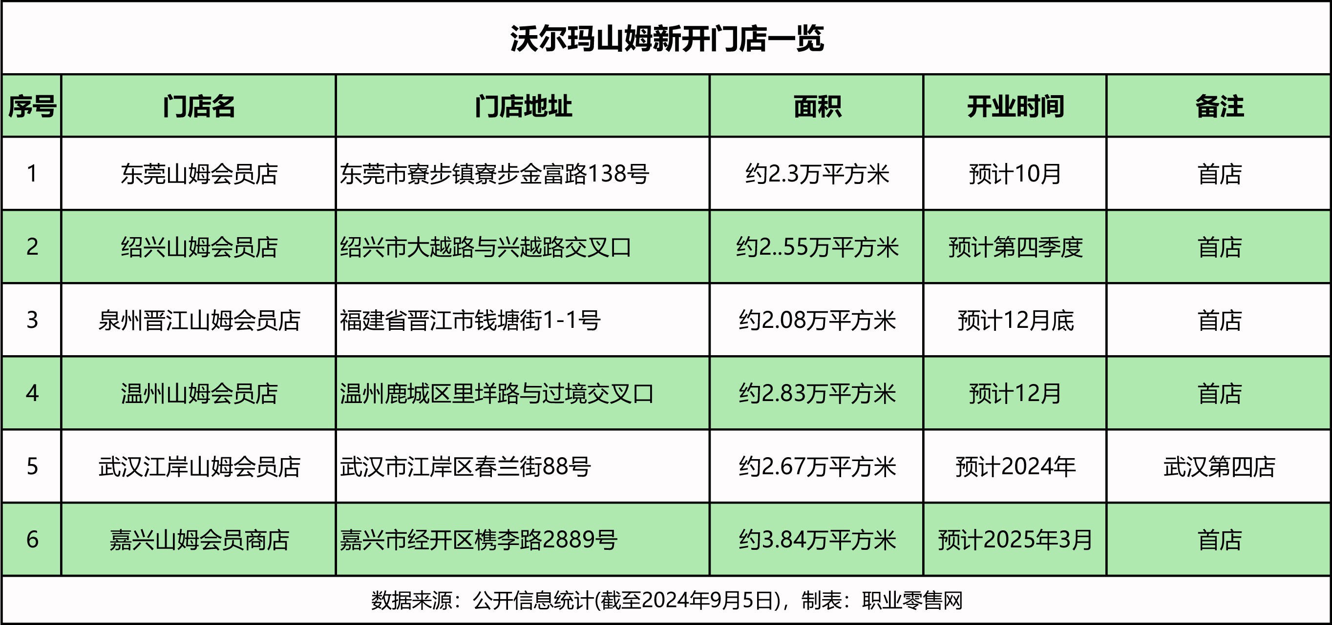 《職業(yè)零售網(wǎng)》獲悉,9月5日,沃爾瑪招聘官方公眾號(hào)發(fā)布了“9月份新店招聘信息”,宣布山姆會(huì)員店將在東莞、紹興、泉州、溫州、武漢、嘉興等六座城市開設(shè)新店,并在積極招聘相關(guān)工作人員。 與8月份發(fā)布的招聘信息相比,新增嘉興山姆會(huì)員店,這也預(yù)示著嘉興山姆已進(jìn)入開業(yè)準(zhǔn)備階段。再往前,南京江北店與成都武侯店分別于5月25日、8月31日盛大啟幕,顯示出山姆正在快速而穩(wěn)健的發(fā)展。 根據(jù)招聘信息顯示,此次新店招聘涉及多個(gè)職位,包括營(yíng)運(yùn)副總、生鮮主廚、生鮮大廚/大廚助理、主廚助理、前臺(tái)/鮮食/樓面/電商/收貨主管、肉類/熟食/壽司技工、HR實(shí)習(xí)生、會(huì)籍推廣員、員工/員工指導(dǎo)、人事行政經(jīng)理/人力資源專員等崗位。 除山姆會(huì)員店外,昆明龍泉大賣場(chǎng)、昆明正大大賣場(chǎng)也在招聘中,職位包括人事行政經(jīng)理/HR實(shí)習(xí)生、鮮食/前臺(tái)/樓面/線上運(yùn)營(yíng)/電商/收貨/資產(chǎn)保護(hù)主管、海鮮肉類/熟食/面包技工等。 值得注意的是,昆明龍泉店與正大店則是接手原家樂(lè)福超市門店。自2023年10月23日家樂(lè)福昆明白云店關(guān)閉后,家樂(lè)福在昆明旗下11家門店已全部關(guān)停,正式退出當(dāng)?shù)厥袌?chǎng)。原昆明家樂(lè)福超市龍泉店與正大店的位置,則被沃爾瑪接手開設(shè)兩家全新門店,其中龍泉店有望在9至10月間正式開業(yè)。 在山姆會(huì)員店6家新店中,除了嘉興店外,位于武漢江岸店、泉州晉江店、東莞寮步店、浙江紹興店和溫州店的五家均計(jì)劃在2024年開業(yè)。其中,東莞寮步店,目前山姆LOGO已上墻亮燈,已進(jìn)入開業(yè)倒計(jì)時(shí),預(yù)計(jì)今年10月份拉開帷幕。而嘉興經(jīng)開店,則是預(yù)計(jì)2025年3月開業(yè)。 東莞山姆會(huì)員商店,位于寮步鎮(zhèn)寮步金富路178號(hào),是山姆在東莞的第一家門店。項(xiàng)目總投資約4.86億元,占地面積超2.3萬(wàn)平方米,共三層,其中一二層用于購(gòu)物,三層、頂樓及地下室用于停車,共規(guī)劃有1097個(gè)停車位。 目前,東莞山姆的logo已掛上墻,并亮燈,預(yù)示著這家新店即將啟幕。在此之前,莞城、寮步極速達(dá)也相繼上線,實(shí)體店預(yù)計(jì)在10月將正式開業(yè)。 紹興山姆會(huì)員商店,位于大越路與興越路交叉口,是山姆在紹興第一家門店,據(jù)說(shuō)是長(zhǎng)三角最大的山姆會(huì)員店。 該項(xiàng)目總投資約5.2億元,門店總用地面積約2.55萬(wàn)平方米,總建筑面積約8萬(wàn)平方米,其中地上建筑面積3.83萬(wàn)平方米,地下建筑面積4.2萬(wàn)平方米。 目前,整個(gè)賣場(chǎng)即將建成,預(yù)計(jì)今年第四季度完工,對(duì)外營(yíng)業(yè)。此前,紹興越城極速達(dá)已于8月11日正式上線。 溫州山姆會(huì)員店,位于溫州市鹿城區(qū)里垟路與過(guò)境路交叉口,是山姆在溫州的第一家門店。該項(xiàng)目占地面積約2.83萬(wàn)平方米,一共分為2層,共規(guī)劃1400余個(gè)停車位。 去年底,溫州山姆會(huì)員店已率先封頂,原來(lái)預(yù)計(jì)于2025年上半年開業(yè)。然而,根據(jù)最新消息,該項(xiàng)目計(jì)劃今年12月開業(yè)。它將打造省內(nèi)體量最大、配貨最全、庫(kù)存最足的山姆會(huì)員系列浙南第一店。 目前,山姆LOGO已正式懸掛,正處于緊鑼密鼓的籌備與建設(shè)沖刺階段。 泉州晉江山姆會(huì)員商店,位于晉江市錢塘街1-1號(hào),將成為繼昆山山姆之后,全國(guó)范圍內(nèi)第二家進(jìn)駐縣級(jí)市的山姆會(huì)員店。 該項(xiàng)目被分為兩期進(jìn)行,一期主要建設(shè)山姆會(huì)員商店,占地約31.274畝,總建筑面積接近7.4萬(wàn)平方米;二期則計(jì)劃投資打造周邊的商業(yè)配套設(shè)施,占地約19.657畝,總建筑面積約為6.4萬(wàn)平方米。 目前,整個(gè)項(xiàng)目的建筑外立面已完工,目前正在進(jìn)行內(nèi)部的一層、二層的裝修及外部的景觀施工。最新消息顯示,泉州晉江山姆會(huì)員店預(yù)計(jì)將于今年12月底開業(yè)。 武漢江岸山姆會(huì)員商店,位于江岸區(qū)春蘭街88號(hào),靠近地鐵6號(hào)線楊汊湖站,是山姆在武漢的第四家門店,預(yù)計(jì)將于年底開業(yè)。 根據(jù)此前公示顯示,該項(xiàng)目總建筑面積約8.58萬(wàn)平方米,從規(guī)劃公示的示意圖顯示,其中一棟商業(yè)建筑具有山姆會(huì)員店風(fēng)格。項(xiàng)目整體用地面積26766.96平方米,商業(yè)面積21604.72平方米,商務(wù)面積16554.24平方米,容積率1.38,配備機(jī)動(dòng)車位658個(gè),非機(jī)動(dòng)車位555個(gè)。 目前,武漢在運(yùn)營(yíng)和在建山姆會(huì)員店已經(jīng)有4家,包括2014年開業(yè)的硚口店、2021年開業(yè)的光谷店、2023年開業(yè)的漢陽(yáng)店,以及即將在年底開業(yè)的江岸店。 嘉興山姆會(huì)員商店,位于經(jīng)開區(qū)槜李路2889號(hào),是山姆在嘉興第一家門店。項(xiàng)目總建筑面積約38373平方米,分地上二層和地下二層,其中地上是商店,地下是停車場(chǎng)。 據(jù)嘉興經(jīng)區(qū)管委會(huì)發(fā)布的信息,嘉興山姆會(huì)員商店力爭(zhēng)在今年12月完成室內(nèi)裝修。據(jù)《聯(lián)商網(wǎng)》報(bào)道,嘉興山姆會(huì)員商店將在205年3月正式開業(yè)