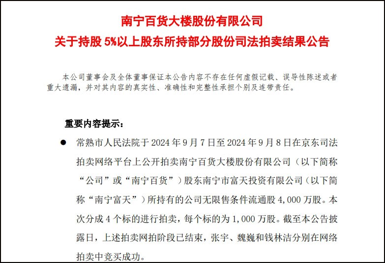 9月10日,南寧百貨大樓股份有限公司發(fā)布公告,披露了其持股5%以上股東所持部分股份的司法拍賣結(jié)果。 此次拍賣活動(dòng)于2024年9月7日至9月8日在京東司法拍賣網(wǎng)絡(luò)平臺(tái)進(jìn)行,涉及南寧百貨4000萬股無限售條件流通股。本次分成4個(gè)標(biāo)的進(jìn)行拍賣,每個(gè)標(biāo)的為1,000萬股。截至本公告披露日,上述拍賣網(wǎng)拍階段已結(jié)束,張宇、魏巍和錢林潔分別在網(wǎng)絡(luò)拍賣中競(jìng)買成功。 其中,張宇以32,440,000元和31,590,000元的價(jià)格兩次競(jìng)得股份,魏巍和錢林潔則分別以32,440,000元和31,590,000元的價(jià)格各競(jìng)得一部分股份。 拍賣成交后,南寧百貨的股東南寧富天若完成過戶,其持股數(shù)量將減少至3,999,331股,占公司總股本的0.73%。此次股份變更不會(huì)影響公司的控股股東和實(shí)際控制人的地位。 根據(jù)減持規(guī)定,受讓方在受讓股份后的6個(gè)月內(nèi)不得減持。 |