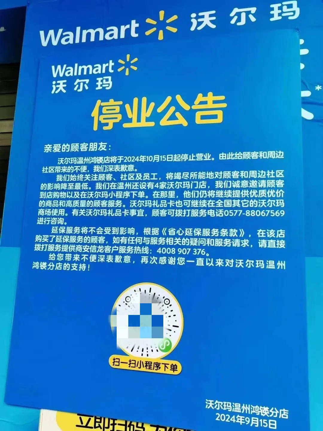 9月15日,沃爾瑪溫州鴻锳店突然發(fā)布了一則公告稱,沃爾瑪溫州鴻锳店將于2024年10月15日起停止營業(yè)。 據(jù)了解,沃爾瑪鴻锳分店地址位于 解放南路鴻鍈大廈1-3層。 這不是沃爾瑪在溫州關閉的第一家門店了。 據(jù)溫州日報報道顯示,1999年,好又多東海店開業(yè);2011年,沃爾瑪全面收購好又多。好又多體育館店易名沃爾瑪東海店。 2020年,沃爾瑪溫州體育館店關停。沃爾瑪體育館店是溫州真正意義上的第一家國際性大型超市,從1999年開始營業(yè),堅持了21年,最終因租約到期而關停。 |