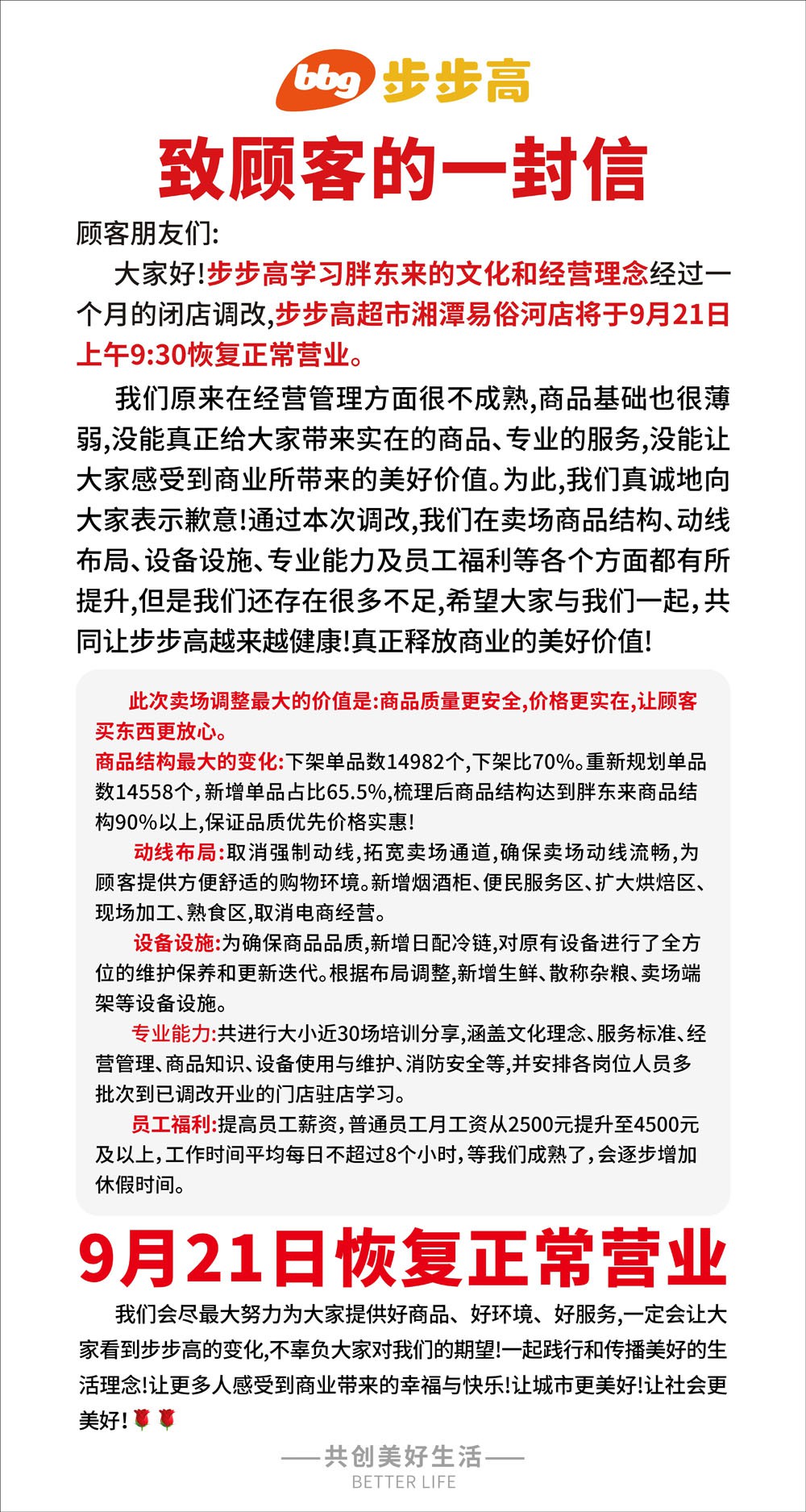 《職業(yè)零售網(wǎng)》獲悉,9月18日消息,經(jīng)過一個(gè)月的閉店調(diào)改,步步高超市易俗河店將于9月21日上午09:30恢復(fù)正常營業(yè)。 此次賣場調(diào)改,主要涉及在賣場商品結(jié)構(gòu)、動(dòng)線布局、設(shè)備設(shè)施、專業(yè)能力及員工福利等各個(gè)方面。 商品結(jié)構(gòu)最大的變化:下架單品數(shù)14982個(gè),下架比70%。重新規(guī)劃單品數(shù)14558個(gè),新增單品占比65.5%,梳理后商品結(jié)構(gòu)達(dá)到胖東來商品結(jié)構(gòu)90%以上,保證品質(zhì)優(yōu)先價(jià)格實(shí)惠! 動(dòng)線布局:取消強(qiáng)制動(dòng)線,拓寬賣場通道,確保賣場動(dòng)線流暢,大顧客提供方便舒適的購物環(huán)境。新增煙酒柜、便民服務(wù)區(qū)、擴(kuò)大烘焙區(qū)現(xiàn)場加工、熟食區(qū),取消電商經(jīng)營。 設(shè)備設(shè)施:為確保商品品質(zhì),新增日配冷鏈,對原有設(shè)備進(jìn)行了全方位的維護(hù)保養(yǎng)和更新迭代。根據(jù)布局調(diào)整,新增生鮮、散稱雜糧、賣場端架等設(shè)備設(shè)施。 專業(yè)能力:共進(jìn)行大小近30場培訓(xùn)分享,涵蓋文化理念、服務(wù)標(biāo)準(zhǔn)、經(jīng)營管理、商品知識、設(shè)備使用與維護(hù)、消防安全等,并安排各崗位人員多批次到已調(diào)改開業(yè)的門店駐店學(xué)習(xí)。 員工福利:提高員工薪資,普通員工月工資從2500元提升至4500元及以上,工作時(shí)間平均每日不超過8個(gè)小時(shí),等我們成熟了,會(huì)逐步增加休假時(shí)間。 值得一提的是,隨著易俗河店的恢復(fù)營業(yè),步步高調(diào)改門店也將達(dá)到6家。截至目前,梅溪湖店、湘潭九華店、星城天地店以及邵陽天地店均已恢復(fù)營業(yè),同時(shí),岳陽花板橋店已正式啟動(dòng)改造。 |