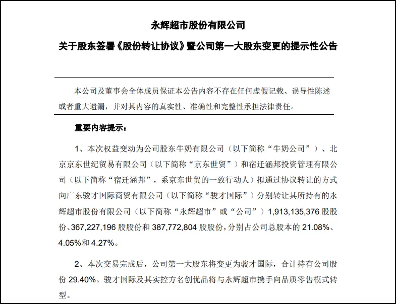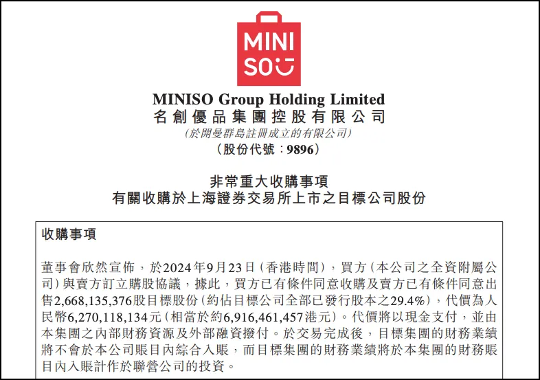 9月23日,永輝超市股份有限公司發(fā)布公告,披露了股東簽署《股份轉(zhuǎn)讓協(xié)議》的事宜,同時(shí)公司第一大股東將發(fā)生變更。 圖來源:永輝公告。 根據(jù)公告,牛奶公司、京東世貿(mào)和宿遷涵邦擬將其持有的永輝超市股份轉(zhuǎn)讓給駿才國際。 具體轉(zhuǎn)讓股份數(shù)量分別為牛奶公司1913135376股(占總股本的21.08%)、京東世貿(mào)367227196股(占總股本的4.05%)、宿遷涵邦387772804股(占總股本的4.27%)。 圖來源:永輝公告。 本次股份轉(zhuǎn)讓完成后,駿才國際將持有永輝超市29.40%的股份,成為公司第一大股東,而駿才國際的控股股東為(廣州)有限責(zé)任公司。此次股份購買的資金來源為駿才國際及其股東的自有及自籌資金。 圖來源:澎湃新聞。 同日,名創(chuàng)優(yōu)品在港交所發(fā)布公告,擬以62.70億元人民幣(相當(dāng)于69.16億港元)收購永輝超市29.4%的股權(quán),其中包括永輝超市原股東牛奶公司持有的21.1%股份及京東持有的8.3%股份。公告顯示,該交易完成后,名創(chuàng)優(yōu)品預(yù)計(jì)將成為永輝超市第一大股東,進(jìn)一步擴(kuò)大其線下零售版圖。 圖來源:名創(chuàng)優(yōu)品。 對(duì)此,名創(chuàng)優(yōu)品創(chuàng)始人、主席兼首席執(zhí)行官葉國富表示:“我堅(jiān)信這筆交易為我們公司帶來了巨大的增長(zhǎng)潛力,并將為我們的股東帶來長(zhǎng)期價(jià)值。在我們的支持下,借助我們?cè)谠O(shè)計(jì)主導(dǎo)產(chǎn)品方面的專業(yè)知識(shí),永輝將準(zhǔn)備好開發(fā)更高質(zhì)量的自有品牌產(chǎn)品,以滿足不斷變化的消費(fèi)者需求。此外,我相信我們與永輝在零售渠道升級(jí)和供應(yīng)鏈方面的合作將使我們能夠共享資源,以進(jìn)一步提高規(guī)模經(jīng)濟(jì),優(yōu)化成本結(jié)構(gòu),為消費(fèi)者創(chuàng)造價(jià)值。同時(shí),我相信永輝超市在胖東來的幫扶下,一定能成功轉(zhuǎn)型,進(jìn)一步滿足顧客對(duì)美好生活的向往。” 不過,目前該交易須遵守慣常的結(jié)算條件,包括獲得中國國家市場(chǎng)監(jiān)管總局的反壟斷許可,獲得或完成其他必要的監(jiān)管批準(zhǔn)或程序,以及獲得名創(chuàng)優(yōu)品股東的批準(zhǔn),預(yù)計(jì)交易將于2025年上半年完成。 當(dāng)天晚上,名創(chuàng)優(yōu)品首席財(cái)務(wù)官張靖京在電話會(huì)上表示,預(yù)計(jì)收購永輝超市29.4%股權(quán)完成后,名創(chuàng)優(yōu)品將成為永輝超市第一大股東,“但我們預(yù)計(jì)不會(huì)控制董事會(huì)的多數(shù)席位,因此,我們不會(huì)作為永輝超市的控股股東、實(shí)控人,也不會(huì)合并財(cái)務(wù)報(bào)表,這是根據(jù)目前的情況做出的判斷。預(yù)計(jì)交易2025年上半年完成,在此期間每一個(gè)重要節(jié)點(diǎn)會(huì)向大家披露! 今年名創(chuàng)優(yōu)品陷入瘋狂擴(kuò)張之中。年初,葉國富在投資者會(huì)上公布的作戰(zhàn)路線圖則更宏大,未來5年,名創(chuàng)優(yōu)品整體計(jì)劃每年新開門店900-1100家,門店總數(shù)翻倍,其中約60%的新門店開在海外。5年后,北美、拉美、歐洲市場(chǎng)門店數(shù)均要達(dá)到1000余家。 8月30日,名創(chuàng)優(yōu)品發(fā)布2024年上半年業(yè)績(jī)報(bào)告。報(bào)告期內(nèi),集團(tuán)營收同比增長(zhǎng)25%至77.6億元;經(jīng)調(diào)整凈利潤同比增長(zhǎng)17.8%至人民幣12.4億元。 名創(chuàng)優(yōu)品披露的半年報(bào)顯示,截至2024年6月30日,其全球門店數(shù)量已經(jīng)達(dá)到6868家。其中,中國內(nèi)地4115家,海外2753家。并且,海外市場(chǎng)的門店凈增加數(shù)量超過了中國內(nèi)地,在今年上半年455家的凈增加門店中,266家為海外門店,占比58%,中國內(nèi)地為189家。 葉國富在業(yè)績(jī)會(huì)上再度強(qiáng)調(diào)了他此前定下的未來五年戰(zhàn)略,其中包括目標(biāo)2024-2028年集團(tuán)每年凈增門店900-1100家。如果按照這個(gè)計(jì)劃,名創(chuàng)優(yōu)品即將在三年后實(shí)現(xiàn)門店數(shù)量破萬。 據(jù)官方顯示,永輝超市是以生鮮商品經(jīng)營為特色的連鎖超市運(yùn)營商,主要經(jīng)營大型綜合超市、超級(jí)市場(chǎng)及社區(qū)超市,門店總數(shù)約838家,遍布全國逾29個(gè)省份及直轄市。 根據(jù)永輝超市8月23日披露半年報(bào),2024年上半年實(shí)現(xiàn)營業(yè)收入377.79億元,同比下降10.11%;凈利潤2.75億元,同比下降26.34%。 報(bào)告期內(nèi)營業(yè)收入下降的原因一方面是零售競(jìng)爭(zhēng)態(tài)勢(shì)十分嚴(yán)峻,由于大環(huán)境的因素,部分消費(fèi)者的消費(fèi)習(xí)慣發(fā)生變化,同時(shí),廣大消費(fèi)者對(duì)商品品質(zhì)、服務(wù)和購物體驗(yàn)有更高的要求,公司客流、客單均出現(xiàn)了一定程度的下降;另一方面是公司主動(dòng)關(guān)閉尾部門店,因此公司報(bào)告期整體收入較上年同期有所下降;但公司已積極主動(dòng)向優(yōu)秀同行學(xué)習(xí),并設(shè)立專項(xiàng),主動(dòng)提升品質(zhì)和服務(wù)。 截至9月24日,胖東來已幫扶永輝調(diào)改三家門店,都在在鄭州,分別是信萬廣場(chǎng)店、瀚海海尚店和裕達(dá)廣場(chǎng)店。同時(shí),永輝通過主動(dòng)學(xué)習(xí)胖東來,已在全國10個(gè)城市率先啟動(dòng)閉店調(diào)改。除了西安、福州、杭州、合