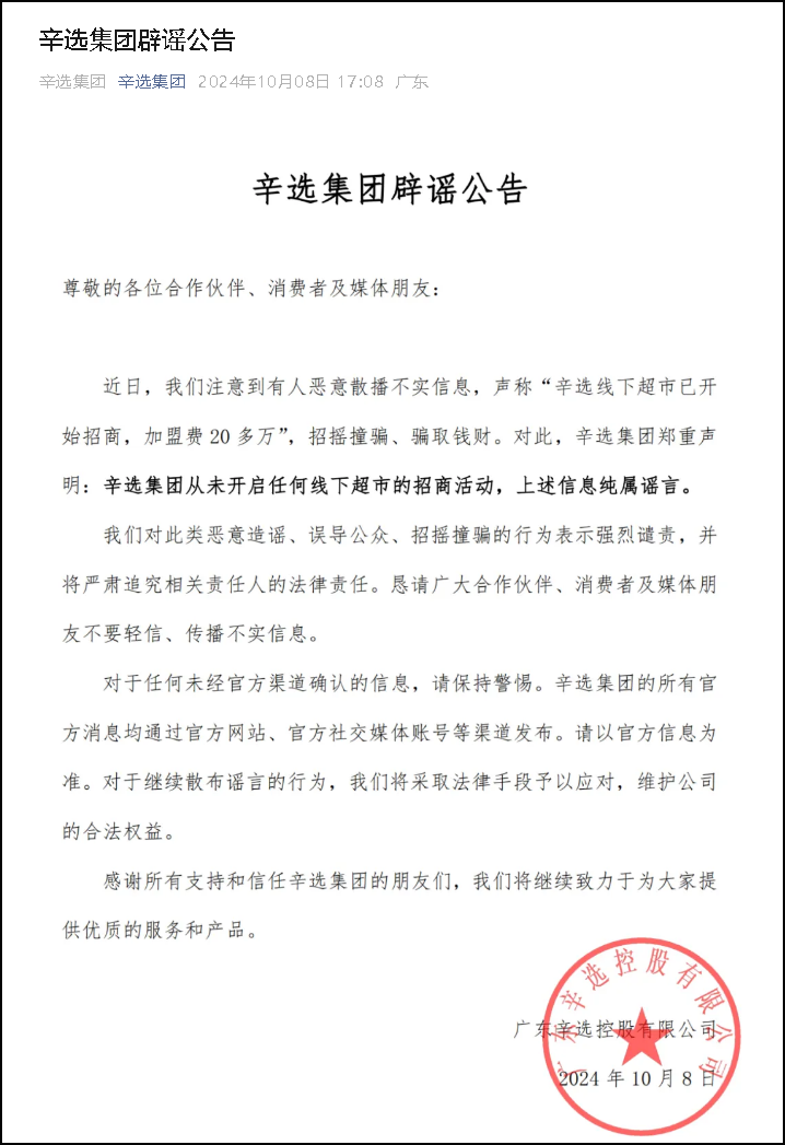 10月8日,辛選集團(tuán)發(fā)布辟謠公告: 近日,我們注意到有人惡意散播不實(shí)信息,聲稱“辛選線下超市已開始招商,加盟費(fèi) 20 多萬(wàn)”,招搖撞騙、騙取錢財(cái)。對(duì)此,辛選集團(tuán)鄭重聲明:辛選集團(tuán)從未開啟任何線下超市的招商活動(dòng),上述信息純屬謠言。 |