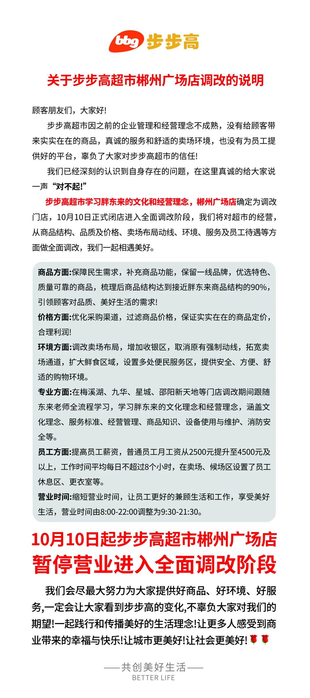 《職業(yè)零售網(wǎng)》獲悉,10月9日,步步高超市發(fā)布調(diào)改說(shuō)明稱,郴州廣場(chǎng)店將于10月10日閉店,進(jìn)入全面調(diào)改階段。 步步高在調(diào)改說(shuō)明中稱,因之前的企業(yè)管理和經(jīng)營(yíng)理念不成熟,沒(méi)有給顧客帶來(lái)實(shí)實(shí)在在的商品,真誠(chéng)的服務(wù)和舒適的賣場(chǎng)環(huán)境,也沒(méi)有為員工提供好的平臺(tái),辜負(fù)了大家對(duì)步步高超市的信任!對(duì)此,也真誠(chéng)的給大家說(shuō)一聲“對(duì)不起”。 調(diào)改說(shuō)明中還表示,此次調(diào)整將對(duì)超市的經(jīng)營(yíng)從商品結(jié)構(gòu)、品質(zhì)及價(jià)格、賣場(chǎng)布局動(dòng)線、環(huán)境、服務(wù)及員工待遇等方面做全面調(diào)改。 在商品方面,以保障民生需求,補(bǔ)充商品功能,保留一線品牌,優(yōu)選特色質(zhì)量可靠的商品,梳理后商品結(jié)構(gòu)達(dá)到接近胖東來(lái)商品結(jié)構(gòu)的90%引領(lǐng)顧客對(duì)品質(zhì)、美好生活的需求! 在價(jià)格方面,優(yōu)化采購(gòu)渠道,過(guò)濾商品價(jià)格,保證實(shí)實(shí)在在的商品定價(jià)合理利潤(rùn)! 在環(huán)境方面,調(diào)改賣場(chǎng)布局,增加收銀區(qū),取消原有強(qiáng)制動(dòng)線,拓寬賣場(chǎng)通道,擴(kuò)大鮮食區(qū)域,設(shè)置多處便民服務(wù)區(qū),提供安全、方便、舒適的購(gòu)物環(huán)境。 在專業(yè)方面,在梅溪湖、九華、星城、邵陽(yáng)新天地等門店調(diào)改期間跟隨東來(lái)老師全流程學(xué)習(xí),學(xué)習(xí)胖東來(lái)的文化理念和經(jīng)營(yíng)理念,涵蓋文化理念、服務(wù)標(biāo)準(zhǔn)、經(jīng)營(yíng)管理、商品知識(shí)、設(shè)備使用與維護(hù)、消防安全等。 在員工方面,提高員工薪資,普通員工月工資從2500元提升至4500元及以上,工作時(shí)間平均每日不超過(guò)8個(gè)小時(shí),在賣場(chǎng)、候場(chǎng)區(qū)設(shè)置了員工休息區(qū)、更衣室等。 最后,在營(yíng)業(yè)時(shí)間方面也進(jìn)行了工作時(shí)間的縮短,讓員工更好的兼顧生活和工作,享受美好生活,營(yíng)業(yè)時(shí)間由8:00-22:00調(diào)整為9:30-21:30。 |
