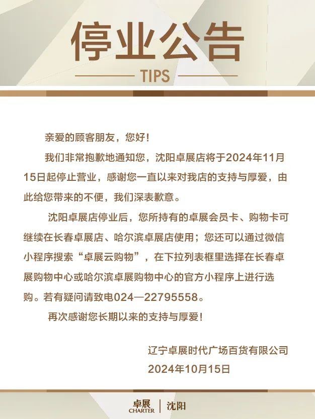 10月15日,卓展購(gòu)物中心沈陽店突發(fā)公告稱,將于11月15日起停止?fàn)I業(yè),停業(yè)后,卓展會(huì)員卡、購(gòu)物卡可在長(zhǎng)春卓展店、哈爾濱卓展店使用。 據(jù)了解,沈陽卓展店開業(yè)于2006年9月8日,距今已有18年歷史! 沈陽卓展集團(tuán)是經(jīng)營(yíng)和管理高端品牌、提供優(yōu)質(zhì)商品的大型連鎖百貨集團(tuán),是東北知名的高端百貨運(yùn)營(yíng)商,集團(tuán)成立于上世紀(jì)90年代,2012年,更名為“卓展集團(tuán)控股有限公司”,目前已在沈陽、長(zhǎng)春、哈爾濱三地開設(shè)卓展購(gòu)物中心 |