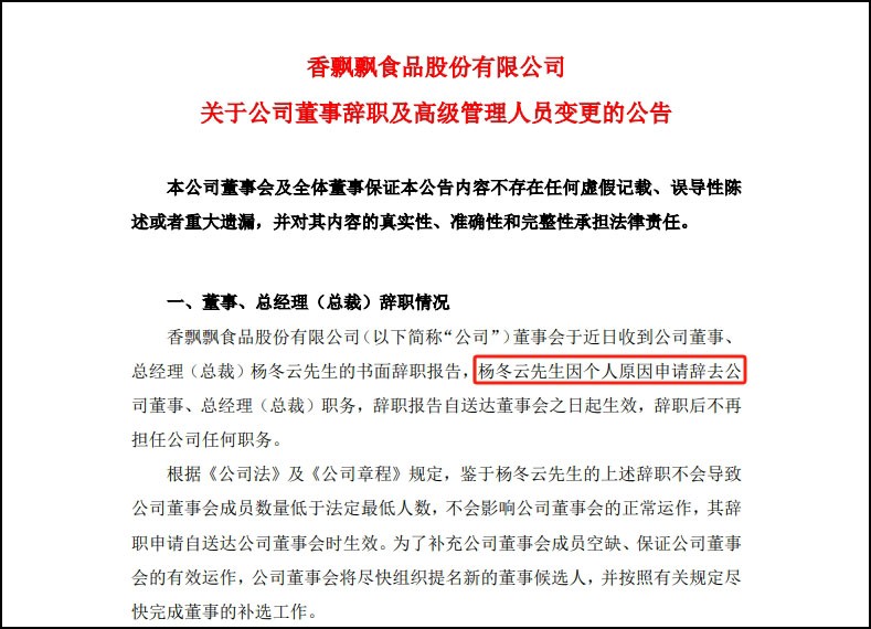 10月21日,香飄飄發(fā)布《關(guān)于公司董事辭職及高級管理人員變更的公告 》。 董事會于近日收到公司董事、總經(jīng)理(總裁)楊冬云的書面辭職報(bào)告,楊冬云因個(gè)人原因申請辭去公司董事、總經(jīng)理(總裁)職務(wù),辭職報(bào)告自送達(dá)董事會之日起生效,辭職后不再擔(dān)任公司任何職務(wù)。香飄飄對他致謝。目前,楊冬云持有該公司5.24%股份。同時(shí),董事長蔣建琪被聘為香飄飄總經(jīng)理。 資料顯示,去年12月21日,香飄飄稱蔣建琪申請辭去總經(jīng)理職務(wù),并聘任楊冬云為總經(jīng)理(總裁),楊冬云1971年出生,曾歷任廣州寶潔公司項(xiàng)目經(jīng)理、大區(qū)域經(jīng)理、品類總監(jiān)、白象食品集團(tuán)執(zhí)行總裁/副總裁、董事等職務(wù)。 |