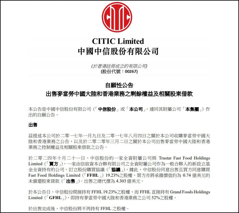10月21日,中信資本控股有限公司(下稱:中信資本)宣布,旗下私募股權(quán)投資業(yè)務(wù)信宸資本與中信股份簽訂協(xié)議,收購中信股份持有的麥當(dāng)勞中國內(nèi)地、香港及澳門業(yè)務(wù)(下稱”麥當(dāng)勞中國”)股份。交易后,中信資本聯(lián)合體(包括中信資本及其旗下私募股權(quán)投資業(yè)務(wù)信宸資本)仍為麥當(dāng)勞中國的控股股東。 中信股份在其公告透露,買家為一家由信宸資本的全資附屬公司作為一般合伙人的新設(shè)立基金全資持有的公司,但未透露新基金的其他合伙人身份。 資料顯示,2017年,中信股份和中信資本入股麥當(dāng)勞中國,與其他股東一起積極推動(dòng)麥當(dāng)勞在中國內(nèi)地和香港的業(yè)務(wù)的發(fā)展。2020年,中信股份將部分麥當(dāng)勞中國股權(quán)轉(zhuǎn)讓給中信資本,此次交易為再度轉(zhuǎn)讓。通過本次交易,中信系在麥當(dāng)勞中國的股份,將從中信股份及中信資本同時(shí)持有,變成中信資本一家持股。 根據(jù)上述公告,此次交易標(biāo)的為Fast Food Holdings Limited(下稱:FFHL)19.23%股權(quán),也就是中信股份間接持有的所有FFHL股權(quán),相當(dāng)于麥當(dāng)勞中國近10%的股權(quán)。包括價(jià)值約為0.74億美元的未償還股東貸款在內(nèi),出售總代價(jià)為4.303億美元(約合人民幣30.56億元)。 目前,F(xiàn)FHL直接持有Grand Foods Holdings Limited,即持有麥當(dāng)勞中國大陸和香港業(yè)務(wù)之公司52%之股權(quán)。出售完成后,中信股份將不再持有FFHL股權(quán)。 對(duì)此,麥當(dāng)勞中國回應(yīng),我們很高興看到,基于對(duì)中國經(jīng)濟(jì)與消費(fèi)市場增長前景以及麥當(dāng)勞中國發(fā)展?jié)摿Φ膱?jiān)定看好,中信資本旗下私募股權(quán)投資業(yè)務(wù)信宸資本加碼麥當(dāng)勞中國。此次交易將進(jìn)一步簡化我們的股權(quán)結(jié)構(gòu)。我們“更強(qiáng)大、更智慧、更美好”達(dá)到10000家餐廳的發(fā)展愿景不變,在股東的支持下,我們將繼續(xù)推動(dòng)麥當(dāng)勞中國未來的發(fā)展。 |