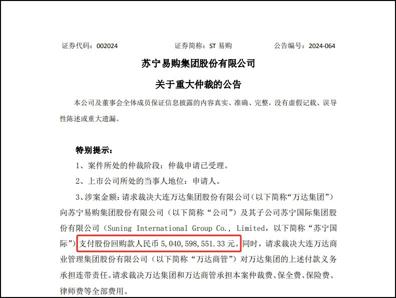 10月22日晚,ST易購發(fā)布一則仲裁公告,公司作為申請人所提出的仲裁請求已獲中國國際經濟貿易仲裁委員會受理。 公告顯示,蘇寧易購請求裁決大連萬達集團股份有限公司向蘇寧易購集團股份有限公司及其子公司蘇寧國際集團有限公司支付股份回購款50.4億元。同時,請求裁決萬達商管對萬達集團的上述付款義務承擔連帶責任。 公告稱,2018年1月29日,蘇寧易購與萬達集團、萬達商管簽署《關于大連萬達商業(yè)地產股份有限公司之戰(zhàn)略合作協議》。公司指定子公司蘇寧國際受讓了《戰(zhàn)略合作協議》項下的權利義務,并由蘇寧國際最終持有萬達商管4.02%的股份。 蘇寧易購認為,萬達集團和萬達商管違反了《戰(zhàn)略合作協議》的約定,且觸發(fā)了《戰(zhàn)略合作協議》中的股份回購條款,萬達集團和萬達商管拒不糾正且拖延回購股份,遂基于實際情況,依據《戰(zhàn)略合作協議》的約定向貿仲申請裁決,請求裁決萬達集團和萬達商管回購部分股份,支付相應的股份回購款。 2014年12月,萬達商業(yè)在港股上市。但上市不久,王健林認為萬達商業(yè)公司被低估,2016年9月,王健林將萬達商業(yè)私有化退市,準備在A股上市。 2018年1月29日,大連萬達集團官方發(fā)布消息稱,騰訊控股作為主發(fā)起方、聯合蘇寧云商、融創(chuàng)中國和京東340億元入股萬達商業(yè),收購萬達商業(yè)香港H股退市時引入的投資人持有的約14%股份。其中,蘇寧出資95億元收購萬達商業(yè)約4.02%股權。 隨后萬達商業(yè)更名為萬達商管集團,但赴A股上市的道路頗為坎坷。2021年3月,萬達商管集團苦等幾年后,宣布撤回A股IPO申請。同時,其對旗下輕資產相關資源進行重組,并于2021年3月下旬成立珠海萬達商管,成為向港股沖擊上市的新主體。 2021年8月,珠海萬達商管與太盟投資、騰訊、鄭裕彤家族等22家機構投資者簽訂對賭協議(計劃2023年底前上市),珠海萬達商管獲得380億元戰(zhàn)投,投資方合計持股達到21.17%;其中太盟投資集團出資約180億元。但2021年10月、2022年4月及10月、2023年6月,珠海萬達商管港交所四次遞交招股書,卻均告失效。 今年3月30日,太盟投資集團、中信資本、Ares Management旗下基金(Ares)、阿布扎比投資局(ADIA)旗下全資子公司和穆巴達拉投資公司在大連簽署投資協議,聯合向大連新達盟商業(yè)管理有限公司投資約600億元。 據悉,大連新達盟的注冊資本高達162.07億元,其子公司為珠海萬達,即此前萬達沖刺上市的商管平臺。這筆投資敲定后,萬達商管對標的公司的持股比例從70.15%降至40%,太盟等外部投資人將合計持有60%的股權。有分析人士認為,此舉解決了萬達商管上市對賭失敗危機,但也導致王健林失去了對萬達商管的絕對控制權。 |
