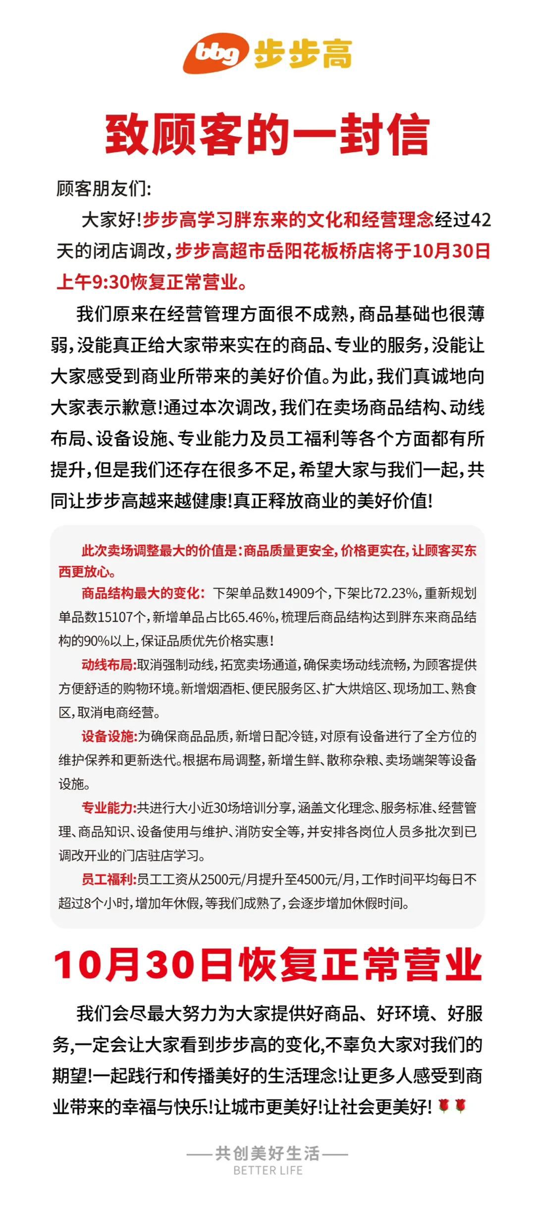 《職業(yè)零售網(wǎng)》獲悉,學習胖東來文化與經(jīng)營管理理念,經(jīng)過42天的閉店調改,步步高超市岳陽花板橋店將于10月30日恢復營業(yè),這是其調改店的第7家門店。 此次賣場調整最大的價值是:商品質量更安全,價格更實在,讓顧客買東西更放心。 商品結構最大的變化:下架單品數(shù)14909個,下架比72.23%,重新規(guī)劃單品數(shù)15107個,新增單品占比65.46%,梳理后商品結構達到胖東來商品結構的90%以上,保證品質優(yōu)先價格實惠! 動線布局:取消強制動線,拓寬賣場通道,確保賣場動線流暢,為顧客提傳方便舒適的購物環(huán)境。新增煙酒柜、便民服務區(qū)、擴大烘焙區(qū)、現(xiàn)場加工、熟食區(qū),取消電商經(jīng)營。 設備設施:為確保商品品質,新增日配冷鏈,對原有設備進行了全方位的維護保養(yǎng)和更新迭代。根據(jù)布局調整,新增生鮮、散稱雜糧、賣場端架等設備設施。 專業(yè)能力:共進行大小近30場培訓分享,涵蓋文化理念、服務標準、經(jīng)營管理、商品知識、設備使用與維護、消防安全等,并安排各崗位人員多批次到已調改開業(yè)的門店駐店學習。 員工福利:員工工資從2500元/月提升至4500元/月,工作時間平均每日不超過8個小時,增加年休假,等我們成熟了,會逐步增加休假時間。 |