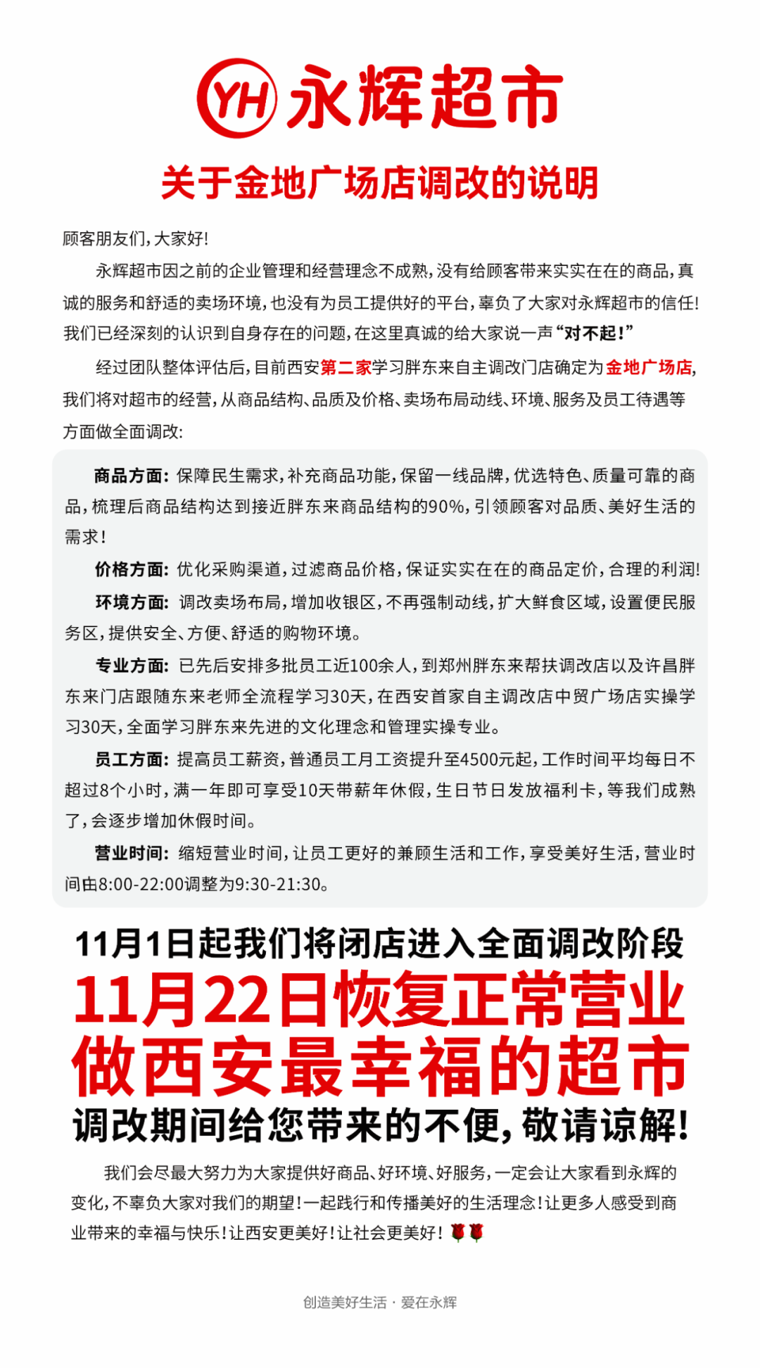 《職業(yè)零售網(wǎng)》獲悉,10月31日,永輝超市陜西大區(qū)發(fā)布西安金地廣場店調(diào)改說明。該店將于11月1日起暫停營業(yè),進行為期22天的改造升級,預(yù)計11月22日重新開業(yè)。 永輝超市表示,因之前的企業(yè)管理和經(jīng)營理念不成熟,沒有給顧客帶來實實在在的商品,真誠的服務(wù)和舒適的賣場環(huán)境,也沒有為員工提供好的平臺,辜負(fù)了大家對永輝超市的信任!因此,在這里給大家說一聲“對不起!” 經(jīng)過團隊整體評估后,西安第二家學(xué)習(xí)胖東來自主調(diào)改門店確定為金地廣場店,并將從商品結(jié)構(gòu)、品質(zhì)及價格、賣場布局動線、環(huán)境、服務(wù)及員工待遇等方面做全面調(diào)改。 在商品方面,保障民生需求,補充商品功能,保留一線品牌,優(yōu)選特色、質(zhì)量可靠的商品,梳理后商品結(jié)構(gòu)達到接近胖東來商品結(jié)構(gòu)的90%,引領(lǐng)顧客對品質(zhì)、美好生活的需求! 在價格方面,優(yōu)化采購渠道,過濾商品價格,保證實實在在的商品定價,合理的利潤!環(huán)境方面:調(diào)改賣場布局,增加收銀區(qū),不再強制動線,擴大鮮食區(qū)域,設(shè)置便民服務(wù)區(qū),提供安全、方便、舒適的購物環(huán)境。 此外,永輝超市還派出了100余名員工前往胖東來學(xué)習(xí)先進的文化理念和管理經(jīng)驗,并將在員工待遇方面做出提升,包括提高薪資、縮短工作時間、增加帶薪休假等。同時,為了讓員工更好地平衡工作和生活,他們還將營業(yè)時間調(diào)整為9:30-21:30。 |