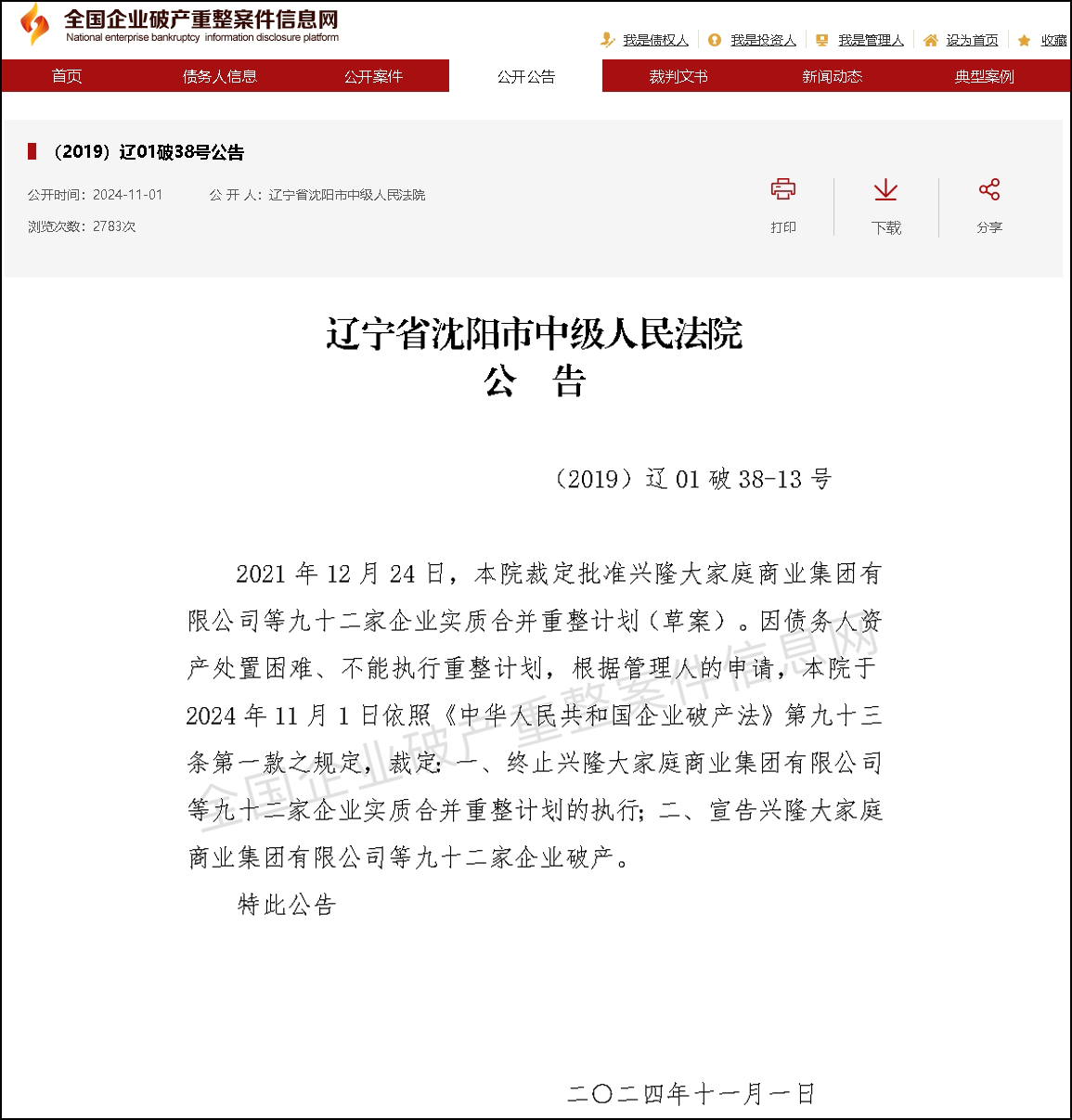 11月4日消息,曾經(jīng)作為遼寧省內(nèi)最負(fù)盛名的民營(yíng)企業(yè)——興隆大家庭商業(yè)集團(tuán),在經(jīng)歷了長(zhǎng)達(dá)三年的艱難重組之路后,最終在2024年11月1日落幕,宣告破產(chǎn)。 自2021年受理興隆大家庭重組計(jì)劃之后,興隆大家庭商業(yè)集團(tuán)92家企業(yè),開(kāi)始對(duì)企業(yè)資產(chǎn)處置,包括沈陽(yáng)、錦州、朝陽(yáng)等地。然而,由于資產(chǎn)處置困難,無(wú)法順利變現(xiàn),興隆大家庭商業(yè)集團(tuán)無(wú)法完成重組計(jì)劃,最終走上了破產(chǎn)的道路。 全國(guó)企業(yè)破產(chǎn)重整案件信息網(wǎng),于2024年11月1日發(fā)布遼寧省沈陽(yáng)市中級(jí)人民法院“(2019)遼01破38-13號(hào)”公告。 據(jù)公告內(nèi)容顯示,2021年12月24日,沈陽(yáng)市中級(jí)人民法院裁定批準(zhǔn)興隆大家庭商業(yè)集團(tuán)有限公司等九十二家企業(yè)實(shí)質(zhì)合并重整計(jì)劃(草案)。因債務(wù)人資產(chǎn)處置困難、不能執(zhí)行重整計(jì)劃,根據(jù)管理人的申請(qǐng),沈陽(yáng)市中級(jí)人民法院于2024年11月1日依照《中華人民共和國(guó)企業(yè)破產(chǎn)法》第九十三條第一款之規(guī)定,裁定: 一、終止興隆大家庭商業(yè)集團(tuán)有限公司等九十二家企業(yè)實(shí)質(zhì)合并重整計(jì)劃的執(zhí)行; 二、宣告興隆大家庭商業(yè)集團(tuán)有限公司等九十二家企業(yè)破產(chǎn)。 圖來(lái)源:全國(guó)企業(yè)破產(chǎn)重整案件信息網(wǎng)。 資料顯示,興隆大家庭商業(yè)集團(tuán)曾是遼寧省最大的民營(yíng)商業(yè)集團(tuán),也是中國(guó)零售業(yè)區(qū)域領(lǐng)軍企業(yè),由董事長(zhǎng)李維龍先生1993年創(chuàng)建于遼寧盤(pán)錦。 1997年,開(kāi)始向外埠發(fā)展,大石橋興隆商城、營(yíng)口興隆購(gòu)物廣場(chǎng)等相繼開(kāi)業(yè)。2001年遼寧興隆大家庭商業(yè)集團(tuán)進(jìn)軍沈陽(yáng),收購(gòu)原東亞廣場(chǎng),組建“沈陽(yáng)興隆大家庭”。興隆大家庭主業(yè)有大型購(gòu)物中心、百貨、奧特萊斯、超市、電子商務(wù)等,輔業(yè)主要有服務(wù)于商場(chǎng)的酒店。 經(jīng)過(guò)多年的發(fā)展,遼寧興隆大家庭商業(yè)集團(tuán),在2010年中國(guó)連鎖百?gòu)?qiáng)排名中,位列第46位;集團(tuán)還先后獲得“全國(guó)光彩之星企業(yè)”、“全國(guó)就業(yè)先進(jìn)單位”、2010年世界零售創(chuàng)新獎(jiǎng)等榮譽(yù)。2012年,在“中國(guó)連鎖百?gòu)?qiáng)”中,排名第48位,在“中國(guó)民營(yíng)500強(qiáng)”中排名163位,在“中國(guó)服務(wù)業(yè)企業(yè)500強(qiáng)”中排名187位。 截止到2019年,興隆大家庭在遼寧、黑龍江兩省22個(gè)城市擁有商場(chǎng)38家、生活超市6家、酒店5家,其它產(chǎn)業(yè)公司3家,商業(yè)經(jīng)營(yíng)面積275余萬(wàn)平方米。 其中,沈陽(yáng)興隆大家庭購(gòu)物中心有限公司成立于2002年8月28日,是興隆大家庭的主力企業(yè);沈陽(yáng)大東興隆百貨有限公司是興隆大家庭在遼寧省內(nèi)投資建設(shè)的第九家大型商場(chǎng),于2007年12月28日開(kāi)業(yè)。 然而,如今興隆大家庭正式宣告破產(chǎn),包括集團(tuán)旗下的92家企業(yè),三年重組計(jì)劃失敗,一個(gè)時(shí)代就此終結(jié)。 |