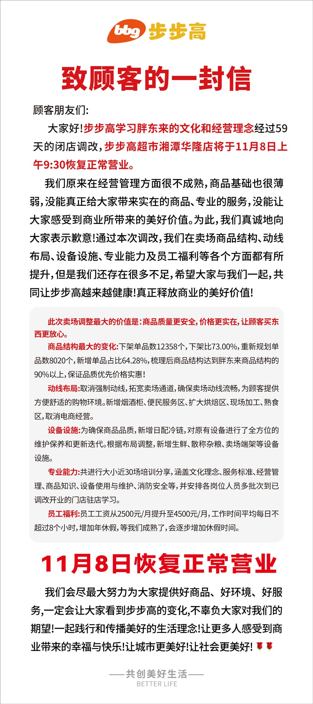 11月6日消息,步步高超市官方平臺宣布,歷經(jīng)60天的調(diào)改,學(xué)習(xí)胖東來文化和經(jīng)營理念,步步高超市湘潭華隆店定于11月8日恢復(fù)營業(yè)。 此調(diào)改,步步高在賣場商品結(jié)構(gòu)、動線布局、設(shè)備設(shè)施、專業(yè)能力及員工福利等各個方面都有所提升。其中調(diào)改最大的價值是:商品質(zhì)量更安全,價格更實在,讓顧客買東西更放心。 在商品結(jié)構(gòu)方面,下架單品數(shù)12358個,下架比73.00%,重新規(guī)劃單品數(shù)8020個,新增單品占比64.28%,梳理后商品結(jié)構(gòu)達到胖東來商品結(jié)構(gòu)的90%以上,保證品質(zhì)優(yōu)先價格實惠! 在動線布局方面,取消強制動線,拓寬賣場通道,確保賣場動線流暢,為顧客提傳方便舒適的購物環(huán)境。新增煙酒柜、便民服務(wù)區(qū)、擴大烘焙區(qū)、現(xiàn)場加工、熟食區(qū),取消電商經(jīng)營。 在設(shè)備設(shè)施方面,為確保商品品質(zhì),新增日配冷鏈,對原有設(shè)備進行了全方位的維護保養(yǎng)和更新迭代。根據(jù)布局調(diào)整,新增生鮮、散稱雜糧、賣場端架等設(shè)備設(shè)施。 在專業(yè)能力方面,共進行大小近30場培訓(xùn)分享,涵蓋文化理念、服務(wù)標(biāo)準(zhǔn)、經(jīng)營管理、商品知識、設(shè)備使用與維護、消防安全等,并安排各崗位人員多批次到已調(diào)改開業(yè)的門店駐店學(xué)習(xí)。 最后,在員工福利方面,員工工資從2500元/月提升至4500元/月,工作時間平均每日不超過8個小時,增加年休假,等我們成熟了,會逐步增加休假時間。 |