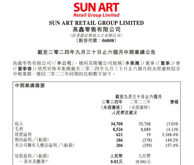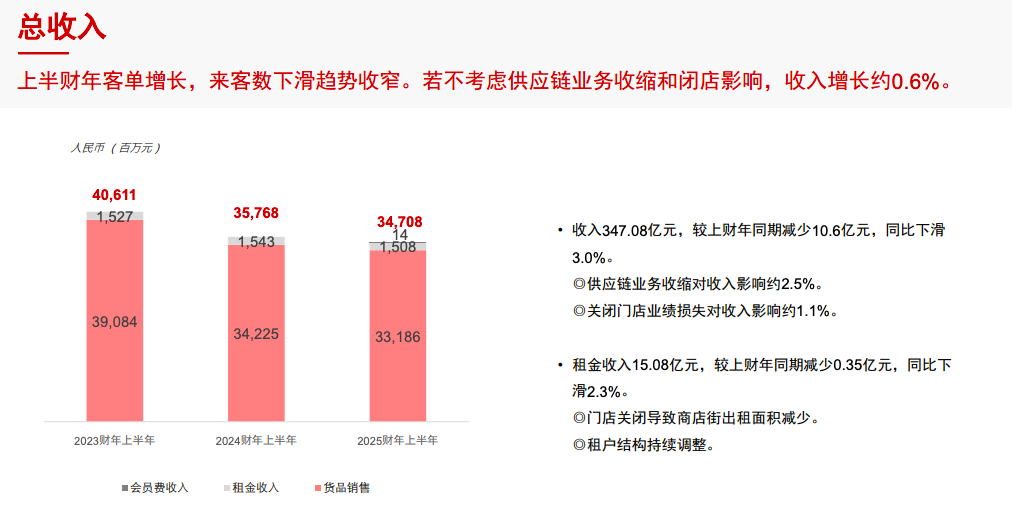 11月12日消息,高鑫零售(大潤(rùn)發(fā))發(fā)布了截至9月30日的2025財(cái)年中期業(yè)績(jī)報(bào)告。數(shù)據(jù)顯示,公司營(yíng)收347.08億元,同比下降3%;稅后溢利增長(zhǎng)至1.86億元,同比增加149.2%;公司擁有人應(yīng)占溢利2.06億元,上年同期虧損3.59億元,同比增加5.65億元,增幅為157%,實(shí)現(xiàn)扭虧為盈。 報(bào)告期內(nèi),高鑫零售(大潤(rùn)發(fā))來(lái)自銷(xiāo)售貨品的收入為人民幣331.86億元,較截至2023年9月30日止同期的人民幣342.25億元減少人民幣10.39億元,減幅為3.0%。該下滑主要原因包括一是關(guān)閉長(zhǎng)期虧損門(mén)店;二是淘菜菜及天貓共享庫(kù)存業(yè)務(wù)等供應(yīng)鏈業(yè)務(wù)收縮。 不過(guò),在按除去供應(yīng)鏈業(yè)務(wù)影響后,同店銷(xiāo)售實(shí)現(xiàn)了0.3%的增長(zhǎng),這主要得益于客單價(jià)的增長(zhǎng),低價(jià)策略及商品策略提升用戶(hù)心智,驅(qū)動(dòng)筆單件增加,用戶(hù)黏性提升。線(xiàn)下?tīng)I(yíng)收表現(xiàn)逐步回暖企穩(wěn),線(xiàn)上新渠道及自有APP成為推動(dòng)同店銷(xiāo)售增長(zhǎng)的主動(dòng)力。 同時(shí),高鑫零售新收入來(lái)源會(huì)員費(fèi)收入所得為0.14億元;租金收入所得為15.08億元,同比減少0.35億元。減幅為2.3%,主要由于上一財(cái)年關(guān)店導(dǎo)致商店街出租面積減少以及租戶(hù)結(jié)構(gòu)調(diào)整帶來(lái)的影響。 財(cái)報(bào)數(shù)據(jù)顯示,高鑫零售毛利為人民幣85.26億元,同比減少人民幣3.63億元,減幅為4.1%。毛利率為24.6%,同比減少0.3個(gè)百分點(diǎn)。高鑫零售官方對(duì)此表示,“本集團(tuán)加速投資并推進(jìn)低價(jià)策略的落地執(zhí)行,以驅(qū)動(dòng)顧客逐漸回歸,經(jīng)營(yíng)表現(xiàn)持續(xù)向好。未來(lái),本集團(tuán)將聚焦?fàn)I收增長(zhǎng)帶動(dòng)毛利持續(xù)增長(zhǎng)! 在線(xiàn)上B2C業(yè)務(wù)上面,同店銷(xiāo)售實(shí)現(xiàn)中單位數(shù)增長(zhǎng),大潤(rùn)發(fā)優(yōu)鮮及線(xiàn)上新渠道成為增長(zhǎng)主動(dòng)力。高鑫零售執(zhí)行董事兼首席執(zhí)行官沈輝表示:“商品和價(jià)格是零售業(yè)的經(jīng)營(yíng)根本,成為商圈領(lǐng)導(dǎo)者是我們的目標(biāo),為顧客節(jié)省每一分錢(qián)是我們的使命! 未來(lái),高鑫零售(大潤(rùn)發(fā))將重塑價(jià)格競(jìng)爭(zhēng)力,并快速調(diào)整不同價(jià)格代的商品入選,加強(qiáng)堡壘商品。 近期,大潤(rùn)發(fā)推出“超省”系列,由自有品牌團(tuán)隊(duì)自行研發(fā)、結(jié)合顧客用戶(hù)需求和對(duì)標(biāo)競(jìng)爭(zhēng)對(duì)手,推出品類(lèi)最低價(jià)商品。此外,大潤(rùn)發(fā)推出了“大潤(rùn)發(fā)必買(mǎi)”“加量不加價(jià)”“天天便宜”等系列超過(guò)1100款單品,打造低價(jià)口碑,塑造價(jià)格心智。其中,今年7月底上市的潤(rùn)發(fā)脆脆蛋撻,以具有競(jìng)爭(zhēng)力的價(jià)格和口味受到消費(fèi)者追捧,上市以來(lái)連續(xù)每月業(yè)績(jī)都穩(wěn)定在1300萬(wàn)元左右,有望成為年銷(xiāo)破億大單品,其爆款路徑正在被復(fù)制到更多大單品上。 在門(mén)店拓展方面,大潤(rùn)發(fā)Super(中超)已在上海、江蘇、安徽、浙江、山東、吉林、湖北、甘肅、四川以及廣東開(kāi)出了30家門(mén)店。大潤(rùn)發(fā)Super依托大賣(mài)場(chǎng)的供應(yīng)鏈資源,從起商品池精選約5000款至8000款商品,分別滿(mǎn)足面積為1500平方米至3000多平方米的大潤(rùn)發(fā)Super門(mén)店。 同時(shí),大潤(rùn)發(fā)積極打造社區(qū)食堂,為社區(qū)居民提供快餐,成為其重要商品配置。今年11月2日開(kāi)業(yè)的昆山花橋大潤(rùn)發(fā)Super店,創(chuàng)造了首日業(yè)績(jī)破百萬(wàn)的紀(jì)錄。高鑫零售官方表示,“該業(yè)態(tài)業(yè)務(wù)模型已經(jīng)跑通,將成為未來(lái)全國(guó)開(kāi)店的主力! 而會(huì)員店方面,報(bào)告期內(nèi),M會(huì)員店已在揚(yáng)州、常州、南京等地開(kāi)出6家會(huì)員店,擁有會(huì)籍?dāng)?shù)超過(guò)36萬(wàn)。M會(huì)員店每月推出200款新品,自有品牌銷(xiāo)售占比超30%。同時(shí)推出全球購(gòu)、最快小時(shí)達(dá)、半日達(dá)等服務(wù)。 截至9月30日6個(gè)月,高鑫零售(大潤(rùn)發(fā))新開(kāi)1家大賣(mài)場(chǎng)和三家M會(huì)員店。同時(shí)關(guān)閉7家大賣(mài)場(chǎng),其中一家改為會(huì)員店。截至報(bào)告期內(nèi),高鑫零售(大潤(rùn)發(fā))共有門(mén)店502家,其中大賣(mài)場(chǎng)466家,大潤(rùn)發(fā)Super(中超)30家以及6家M會(huì)員店。 高鑫零售董事長(zhǎng)黃明端表示:“經(jīng)過(guò)短短半年的回歸和調(diào)整,高鑫零售已重回健康增長(zhǎng)軌道,上半財(cái)年的經(jīng)營(yíng)表現(xiàn),為新財(cái)年開(kāi)了一個(gè)好頭,讓我們對(duì)未來(lái)充滿(mǎn)信心和期待! “我們積極踐行照顧同仁、服務(wù)顧客、精益求精的價(jià)值觀,為顧客提供新鮮、便宜、便利、舒適的購(gòu)物環(huán)境,努力實(shí)現(xiàn)本財(cái)年經(jīng)營(yíng)目標(biāo)。”沈輝表示。 |