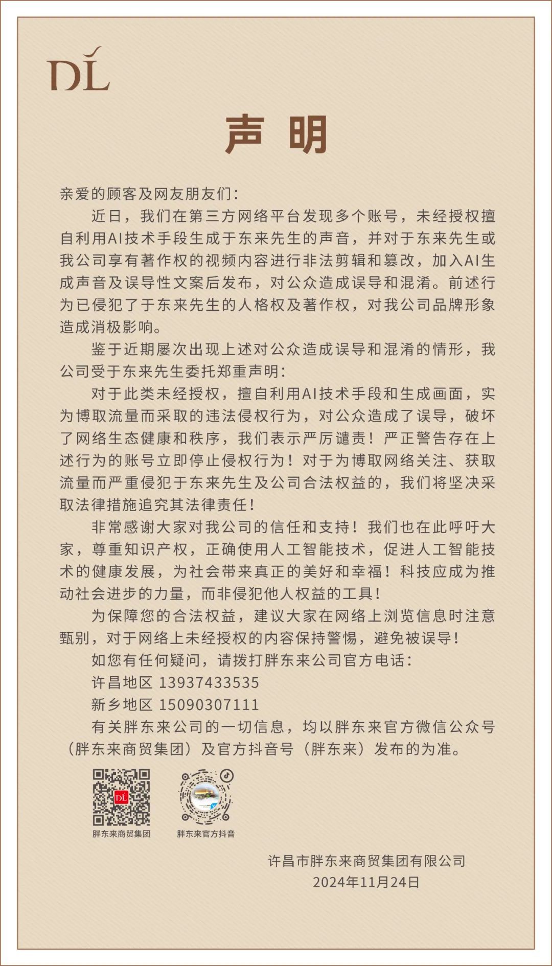 11月24日下午,胖東來商貿(mào)集團發(fā)布聲明稱,近日,該集團在第三方網(wǎng)絡平臺發(fā)現(xiàn)多個賬號,未經(jīng)授權擅自利用AI技術手段生成于東來的聲音,并對于東來或胖東來商貿(mào)集團享有著作權的視頻內容進行非法剪輯和篡改,加入AI生成聲音及誤導性文案后發(fā)布,對公眾造成誤導和混淆。 聲明指出:“前述行為已侵犯了于東來先生的人格權及著作權,對我公司品牌形象造成消極影響!迸謻|來表示,嚴正警告存在上述行為的賬號立即停止侵權行為,對于為博取網(wǎng)絡關注、獲取流量而嚴重侵犯于東來及公司合法權益的,將堅決采取法律措施追究其法律責任。 此前,在社交媒體平臺上,有不少視頻用AI合成于東來的聲音,并用該合成聲音說:“我是于東來,我親手打造了中國第一家值得人民百分百信任的公司! |