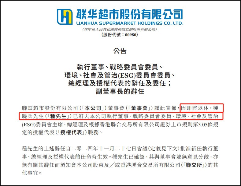 11月27日,聯(lián)華超市股份有限公司發(fā)布公告,因即將退休,種曉兵先生已辭去執(zhí)行董事、戰(zhàn)略委員會(huì)委員、環(huán)境、社會(huì)及管治(ESG)委員會(huì)主席、總經(jīng)理及授權(quán)代表職務(wù)。種先生的上述辭任自2024年11月27日會(huì)議批準(zhǔn)新任執(zhí)行董事、總經(jīng)理及授權(quán)代表的任命時(shí)生效。 另外,王曉琰女士已獲委任為董事會(huì)執(zhí)行董事、戰(zhàn)略委員會(huì)委員及環(huán)境、社會(huì)及管治(ESG)委員會(huì)委員,其初始任期由2024年11月27日起至公司下一次股東周年大會(huì)結(jié)束之日止,且符合資格重選連任。 同時(shí),王曉琰自2024年11月27日起獲委任為總經(jīng)理及授權(quán)代表。上述有關(guān)王女士的委任于會(huì)議上該等委任獲批準(zhǔn)時(shí)生效。 而張慧勤女士因其他工作安排,已于本公告日期辭去公司董事會(huì)副董事長職務(wù),繼續(xù)擔(dān)任執(zhí)行董事、戰(zhàn)略委員會(huì)委員及薪酬與考核委員會(huì)委員職務(wù)。 |