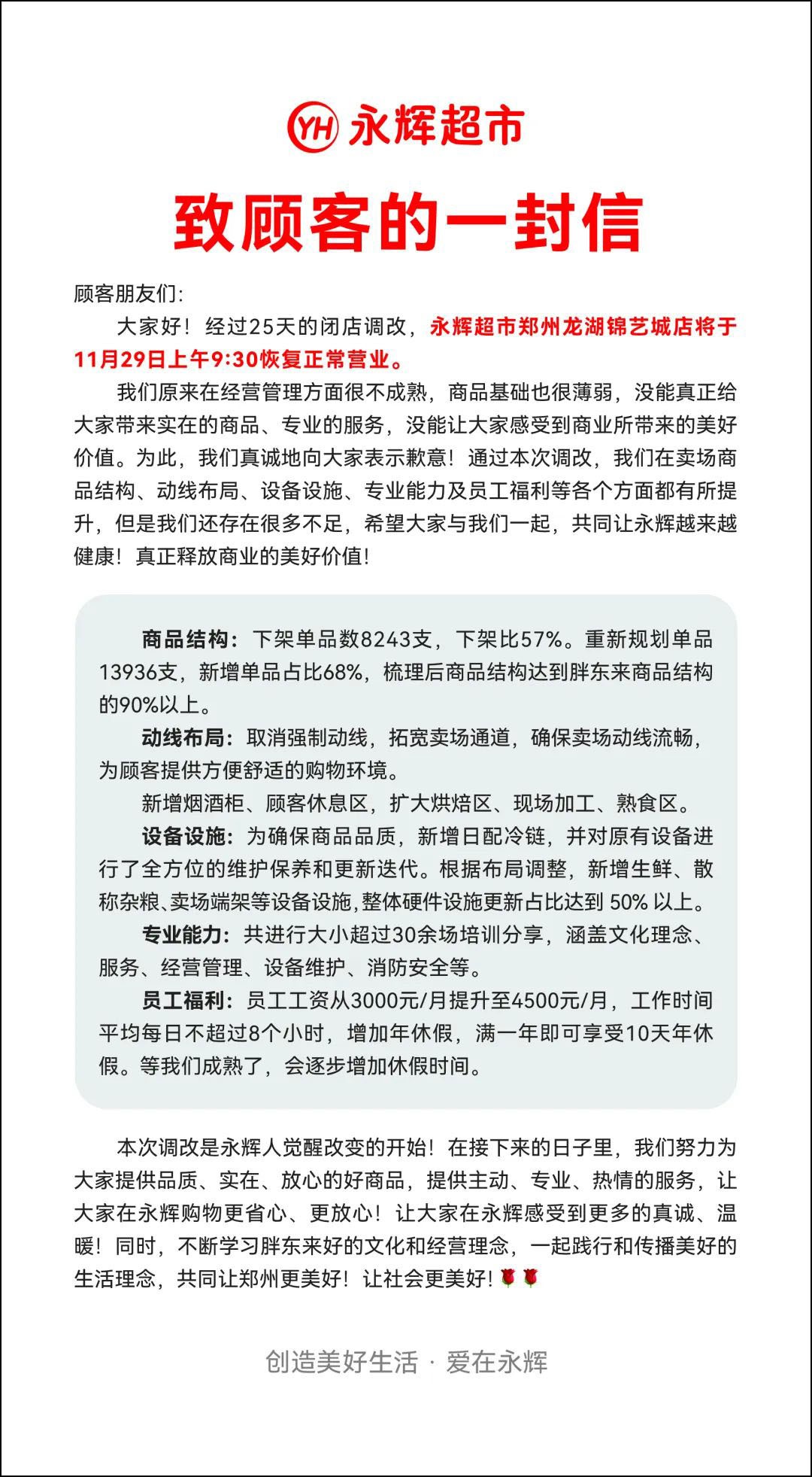 《職業(yè)零售網(wǎng)》獲悉,11月28日,上海永輝超市官方發(fā)布公告,宣布首家學(xué)習(xí)胖東來(lái)自主調(diào)改店落戶金山萬(wàn)達(dá)。 公告中指出,經(jīng)過(guò)團(tuán)隊(duì)的全面評(píng)估,確定上海首家學(xué)習(xí)胖東來(lái)模式自主調(diào)改的門店為上海金山萬(wàn)達(dá)店,將對(duì)超市的經(jīng)營(yíng)全面升級(jí)。升級(jí)內(nèi)容包括但不限于商品結(jié)構(gòu)、品質(zhì)控制、價(jià)格策略、賣場(chǎng)布局、動(dòng)線優(yōu)化、環(huán)境改善、服務(wù)提升以及員工待遇等多個(gè)方面。 在商品方面,超市將重點(diǎn)保障民生需求,補(bǔ)充商品功能,保留一線品牌的同時(shí),優(yōu)選那些特色鮮明、質(zhì)量可靠的商品。對(duì)于品質(zhì)沒有保障的商品,將堅(jiān)決予以淘汰。此外,還將規(guī)劃補(bǔ)充時(shí)尚商品品類,以滿足顧客對(duì)品質(zhì)生活和美好事物的追求。 價(jià)格方面,超市將積極優(yōu)化采購(gòu)渠道,嚴(yán)格過(guò)濾商品價(jià)格,確保每一件商品都能以實(shí)實(shí)在在的定價(jià)呈現(xiàn)給顧客,同時(shí)保持合理的利潤(rùn)空間。 環(huán)境方面,調(diào)改后的賣場(chǎng)布局將更加人性化,不再?gòu)?qiáng)制動(dòng)線,為顧客提供一個(gè)安全、方便、舒適的購(gòu)物環(huán)境。 員工方面,超市將大力提升員工薪資福利,減少工時(shí),增加休假等福利待遇,讓員工能夠在輕松快樂的工作氛圍中,凈心專注地投入到服務(wù)中,用真誠(chéng)的服務(wù)贏得每一位顧客的信賴。 據(jù)了解,目前永輝在全國(guó)已開業(yè)18家調(diào)改門店,春節(jié)前預(yù)計(jì)會(huì)達(dá)到40-50家,是全國(guó)調(diào)改門店最多的胖東來(lái)學(xué)習(xí)者。2024年12月,永輝將有多家門店結(jié)束調(diào)改重新營(yíng)業(yè),遍及遵義、杭州、鄭州、貴陽(yáng)、廣州、北京、福州、成都等地,“學(xué)習(xí)胖東來(lái)”調(diào)改正在穩(wěn)步推進(jìn)中。 |