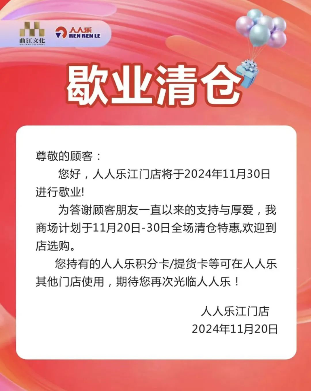 11月30日,人人樂(lè)江門(mén)店正式歇業(yè)清倉(cāng)。 據(jù)悉,這家位于江會(huì)路、禮樂(lè)大橋旁的人人樂(lè)江門(mén)店,自2002年開(kāi)業(yè)以來(lái),已經(jīng)陪伴了江門(mén)市民23年之久。它不僅是當(dāng)?shù)氐囊粋(gè)商業(yè)地標(biāo),更成為了不少80后、90后的童年回憶。 近年來(lái),隨著市場(chǎng)競(jìng)爭(zhēng)的加劇和消費(fèi)模式的變化,人人樂(lè)全國(guó)各地多家商超連續(xù)出現(xiàn)虧損,2023年在全國(guó)范圍內(nèi)閉店22家。江門(mén)人人樂(lè)也因經(jīng)營(yíng)虧損長(zhǎng)期拖欠水電費(fèi),最終不得不歇業(yè)撤場(chǎng)。這一消息讓許多市民感嘆不已,紛紛前來(lái)清倉(cāng)“掃貨”,緬懷曾經(jīng)的購(gòu)物時(shí)光。 |