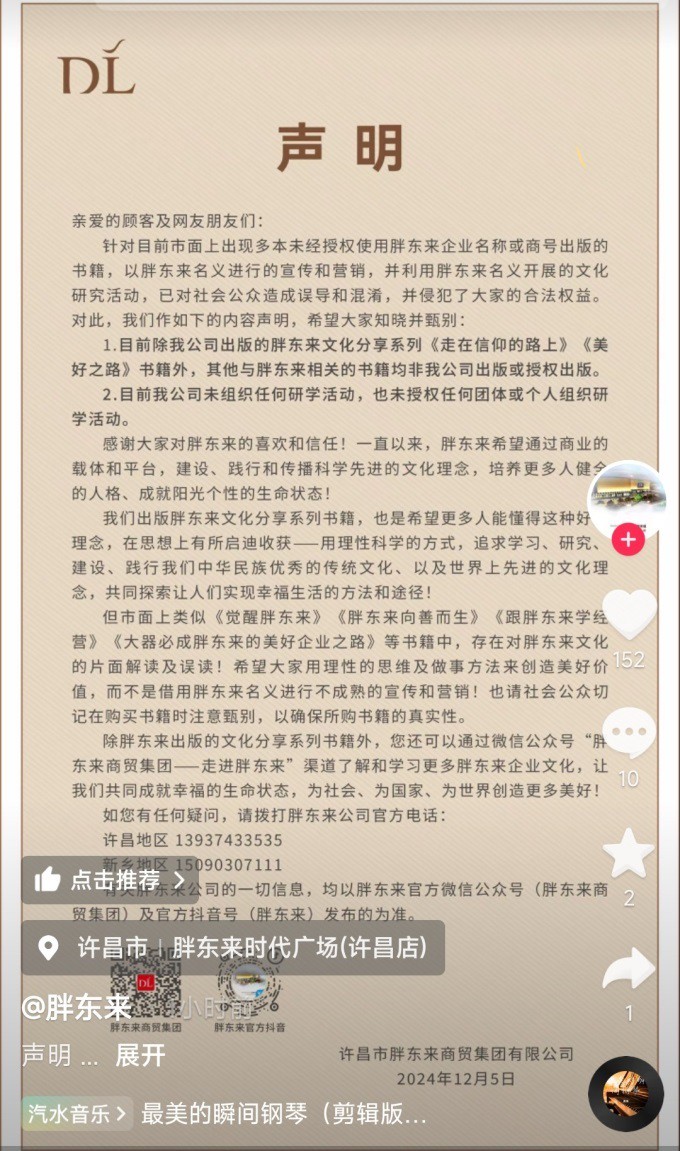 12月5日,胖東來(lái)發(fā)布聲明稱,目前市面上出現(xiàn)多本未經(jīng)授權(quán)使用胖東來(lái)企業(yè)名稱或商號(hào)出版的書(shū)籍,以胖東來(lái)名義進(jìn)行的宣傳和營(yíng)銷(xiāo),并利用胖東來(lái)名義開(kāi)展的文化研究活動(dòng),已對(duì)社會(huì)公眾造成誤導(dǎo)和混淆,并侵犯了大家的合法權(quán)益。 對(duì)此,胖東來(lái)表示,希望大家知曉并甄別,目前除胖東來(lái)出版的胖東來(lái)文化分享系列《走在信仰的路上》《美好之路》書(shū)籍外,其他與胖東來(lái)相關(guān)的書(shū)籍均非胖東來(lái)出版或授權(quán)出版;目前胖東來(lái)未組織任何研學(xué)活動(dòng),也未授權(quán)任何團(tuán)體或個(gè)人組織研。 胖東來(lái)也感謝大家對(duì)其的喜歡和信任,并稱一直以來(lái),胖東來(lái)希望通過(guò)商業(yè)的載體和平臺(tái),建設(shè)、踐行和傳播科學(xué)先進(jìn)的文化理念,培養(yǎng)更多人健全的人格、成就陽(yáng)光個(gè)性的生命狀態(tài)! 此外,胖東來(lái)表示,出版胖東來(lái)文化分享系列書(shū)籍,也是希望更多人能懂得這種好的理念,在思想上有所啟迪收獲-用理性科學(xué)的方式,追求學(xué)習(xí)、研究、建設(shè)、踐行我們中華民族優(yōu)秀的傳統(tǒng)文化、以及世界上先進(jìn)的文化理念,共同探索讓人們實(shí)現(xiàn)幸福生活的方法和途徑! 不過(guò),市面上類(lèi)似《覺(jué)醒胖東來(lái)》《胖東來(lái)向善而生》《跟胖東來(lái)學(xué)經(jīng)營(yíng)》《大器必成胖東來(lái)的美好企業(yè)之路》等書(shū)籍中,存在對(duì)胖東來(lái)文化的片面解讀及誤讀!希望大家用理性的思維及做事方法來(lái)創(chuàng)造美好價(jià)值,而不是借用胖東來(lái)名義進(jìn)行不成熟的宣傳和營(yíng)銷(xiāo)。 胖東來(lái)提醒,切記在購(gòu)買(mǎi)書(shū)籍時(shí)注意甄別,以確保所購(gòu)書(shū)籍的真實(shí)性。 |