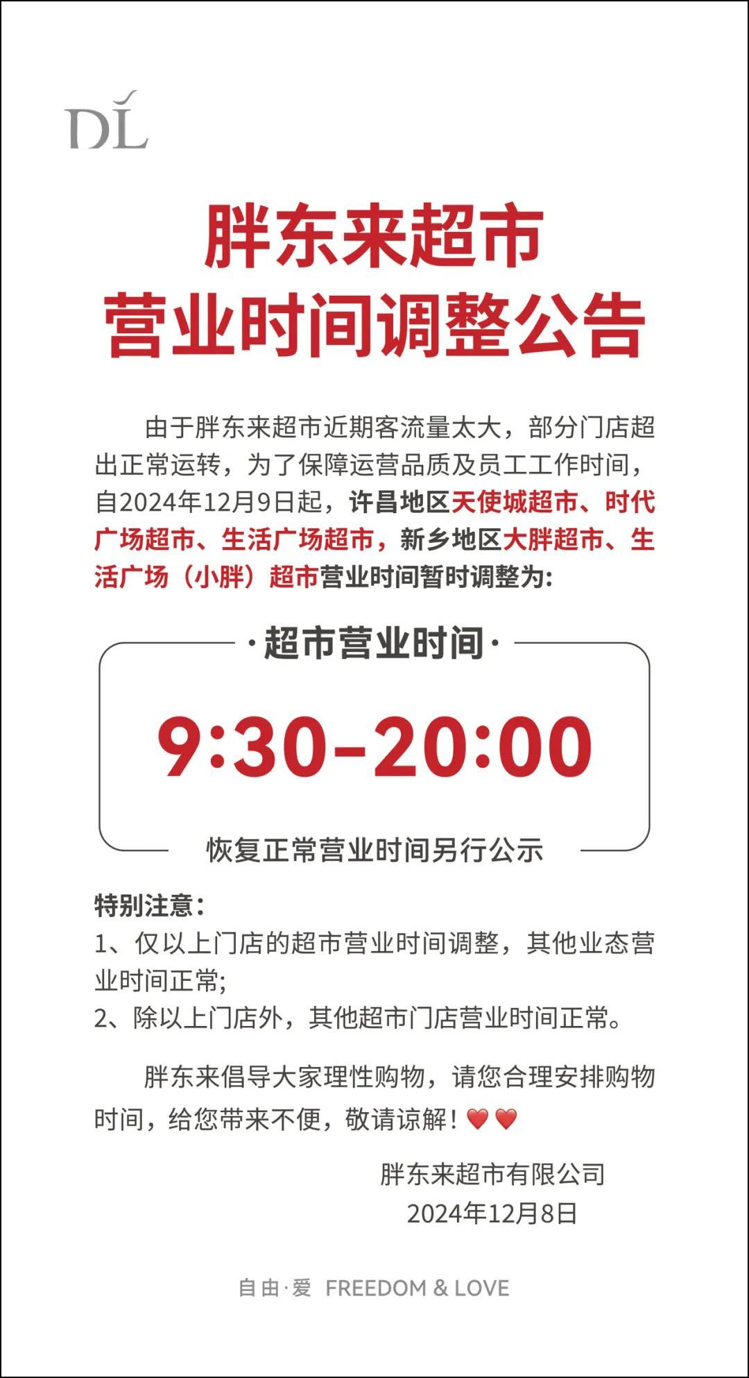 《職業(yè)零售網(wǎng)》獲悉,12月8日,胖東來發(fā)布超市營業(yè)時(shí)間調(diào)整公告。 公告中表示,由于胖東來超市近期客流量太大,部分門店超出正常運(yùn)轉(zhuǎn),為了保障運(yùn)營品質(zhì)及員工工作時(shí)間,自2024年12月9日起,許昌地區(qū)天使城超市、時(shí)代廣場超市、生活廣場超市,新鄉(xiāng)地區(qū)大胖超市、生活廣場(小胖)超市營業(yè)時(shí)間暫時(shí)調(diào)整為9:30-20:00,恢復(fù)正常營業(yè)時(shí)間另行公示。 值得注意的是,此次僅以上門店的超市營業(yè)時(shí)間調(diào)整,其他業(yè)態(tài)營業(yè)和門店?duì)I業(yè)時(shí)間正常。同時(shí),胖東來倡導(dǎo)大家理性購物。 據(jù)了解,調(diào)整前胖東來超市的營業(yè)時(shí)間為:周日至周四:9:30-21:00;周五至周六:9:30-21:30。調(diào)整后,周日至周四營業(yè)時(shí)間縮短了一個(gè)小時(shí),周五至周六營業(yè)時(shí)間縮短了一個(gè)半小時(shí)。 |