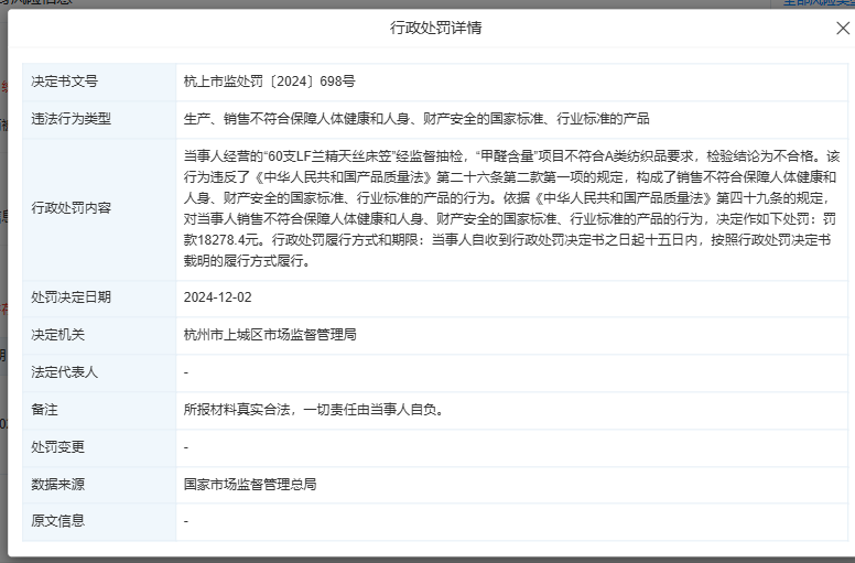 天眼查天眼風(fēng)險(xiǎn)信息顯示,近日,杭州山姆會員商店有限公司因生產(chǎn)、銷售不符合保障人體健康和人身、財(cái)產(chǎn)安全的國家標(biāo)準(zhǔn)、行業(yè)標(biāo)準(zhǔn)的產(chǎn)品,被杭州市上城區(qū)市場監(jiān)督管理局罰款1.8萬余元。處罰事由顯示,當(dāng)事人經(jīng)營的“60支LF蘭精天絲床笠”經(jīng)監(jiān)督抽檢,“甲醛含量”項(xiàng)目不符合A類紡織品要求,檢驗(yàn)結(jié)論為不合格。 12月15日,杭州某山姆會員商店的工作人員向南都灣財(cái)社記者表示,涉事商品確實(shí)被抽檢出甲醛超標(biāo),并稱公司已經(jīng)第一時(shí)間下架涉事產(chǎn)品,目前沒有在售。該工作人員表示,如果消費(fèi)者購買了,門店支持退貨退款,目前銷售的產(chǎn)品都是合格的。 同日,沃爾瑪中國相關(guān)負(fù)責(zé)人向南都灣財(cái)社記者表示,山姆一貫重視商品質(zhì)量,對于這個(gè)問題公司致以最誠摯的歉意,也第一時(shí)間對商品進(jìn)行了下架處理,“我們會持續(xù)加強(qiáng)對供應(yīng)商的篩選與審核,商品的進(jìn)貨查驗(yàn)等相關(guān)流程的管理”。 |