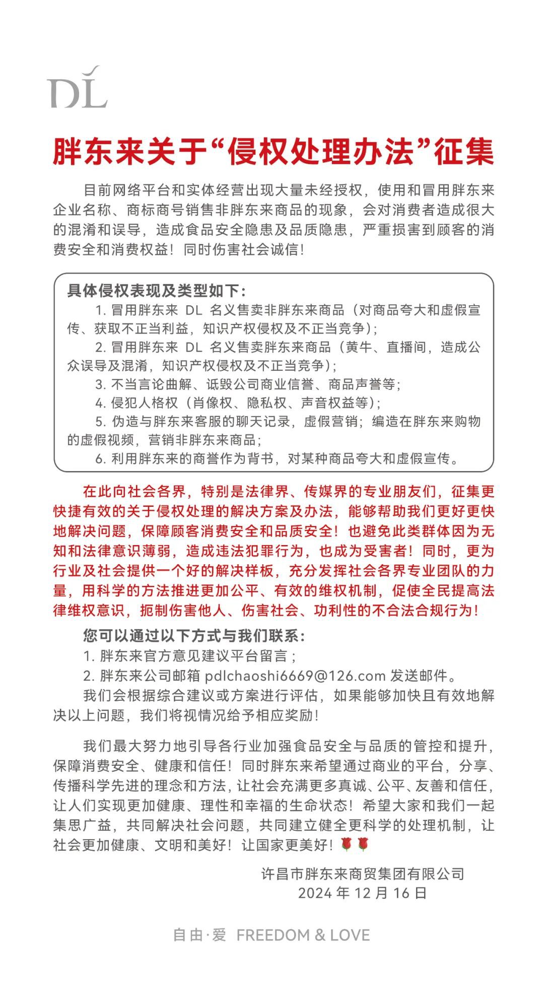 12月16日晚間,胖東來官方賬號發(fā)文,公開征集胖東來關(guān)于“侵權(quán)處理辦法”: 目前網(wǎng)絡(luò)平臺和實(shí)體經(jīng)營出現(xiàn)大量未經(jīng)授權(quán),使用和冒用胖東來企業(yè)名稱、商標(biāo)商號銷售非胖東來商品的現(xiàn)象,會對消費(fèi)者造成很大的混淆和誤導(dǎo),造成食品安全隱患及品質(zhì)隱患,嚴(yán)重?fù)p害到顧客的消費(fèi)安全和消費(fèi)權(quán)益!同時(shí)傷害社會誠信! 具體侵權(quán)表現(xiàn)及類型如下: 1.冒用胖東來 DL 名義售賣非胖東來商品(對商品夸大和虛假宣傳、獲取不正當(dāng)利益,知識產(chǎn)權(quán)侵權(quán)及不正當(dāng)競爭); 2.冒用胖東來 DL 名義售賣胖東來商品(黃牛、直播間,造成公眾誤導(dǎo)及混淆,知識產(chǎn)權(quán)侵權(quán)及不正當(dāng)競爭); 3.不當(dāng)言論曲解、詆毀公司商業(yè)信譽(yù)、商品聲譽(yù)等; 4.侵犯人格權(quán)(肖像權(quán)、隱私權(quán)、聲音權(quán)益等); 5.偽造與胖東來客服的聊天記錄,虛假營銷;編造在胖東來購物的虛假視頻,營銷非胖東來商品; 6.利用胖東來的商譽(yù)作為背書,對某種商品夸大和虛假宣傳。 胖東來方面表示,在此向社會各界,特別是法律界、傳媒界的專業(yè)朋友們,征集更快捷有效的關(guān)于侵權(quán)處理的解決方案及辦法,能夠幫助我們更好更快地解決問題,保障顧客消費(fèi)安全和品質(zhì)安全! |