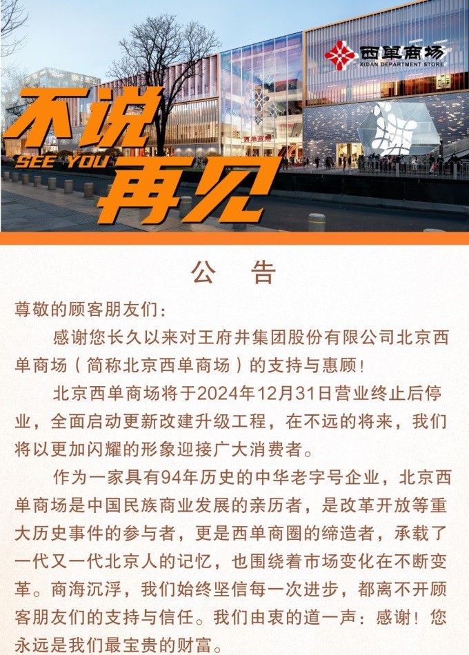 12月16日,北京西單商場發(fā)布停業(yè)改建公告。 根據(jù)公告,北京西單商場將于2024年12月31日營業(yè)終止后停業(yè),全面啟動更新改建升級工程。 公開資料顯示:北京西單商場始建于1930年,截至目前已經(jīng)擁有94年歷史。上世紀(jì)80年代重新落成時,它是北京最具標(biāo)志性的百貨商場之一,與東安市場、東四人民市場(現(xiàn)隆福大廈)、北京市百貨大樓并稱為“北京市四大百貨”。 商場現(xiàn)有的主體建筑于1978年正式對外營業(yè),隨后于1995年和2003年經(jīng)歷了兩次重要的擴(kuò)建和改造。 1986-1993年,西單商場連續(xù)八年奪得北京市大型百貨店年銷售額第一,并成為北京首家年銷售額突破10億元的單體店。 10月30日,王府井集團(tuán)股份有限公司發(fā)布關(guān)于固定資產(chǎn)處置的公告。其中提到,為推進(jìn)公司西單商場優(yōu)化改造項目實施,提升西單商場在西單商圈的競爭力,公司計劃對西單商場進(jìn)行改造提升。 根據(jù)《聯(lián)商網(wǎng)》次年報道,西單商場已完成改造升級設(shè)計方案,未來整體建筑面積65000㎡,其中規(guī)劃兩層作為停車設(shè)施,其余面積將作為經(jīng)營使用。商場的整體商戶數(shù)量將控制在200個以內(nèi),實現(xiàn)減量提質(zhì),打造集約、高品質(zhì)商業(yè)業(yè)態(tài)。商場地下一層將設(shè)置“西單記憶1930”文化街區(qū),引入文藝演出、電影等文化體驗業(yè)態(tài)。 商場負(fù)責(zé)人表示,改造期間商場將轉(zhuǎn)向線上經(jīng)營,確保顧客的需求得到滿足。同時,商場也將繼續(xù)與社會各界保持溝通,收集市民的意見和建議,不斷完善改造方案。 |