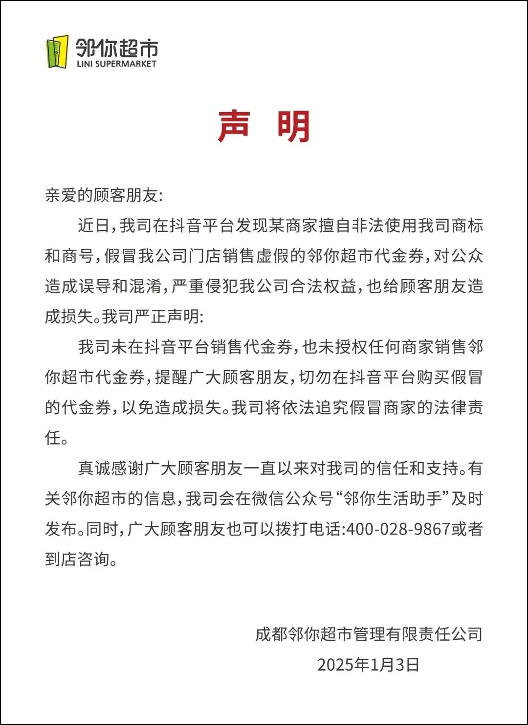 針對此情況,鄰你超市聲明表示,鄰你超市未在抖音平臺銷售代金券,也未授權(quán)任何商家在抖音平臺銷售鄰你超市代金券。廣大顧客朋友在購買代金券時,請務(wù)必注意辨別真?zhèn)危形鹪诙兑羝脚_購買假冒的代金券,以免造成不必要的經(jīng)濟損失。同時,鄰你超市公司將依法追究假冒商家的法律責(zé)任,堅決維護自身合法權(quán)益和顧客利益。 |