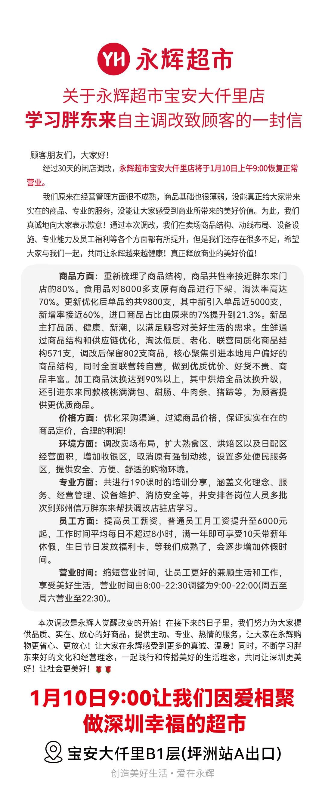 《職業(yè)零售網(wǎng)》獲悉,1月7日,廣東永輝超市官方發(fā)布《致顧客的一封信》。 公開信表示,經(jīng)過30天的閉店全面調(diào)改,永輝超市寶安大仟里店將于1月10日上午9:00正式恢復(fù)營業(yè)。 此次調(diào)改是永輝超市針對自身在經(jīng)營管理、商品結(jié)構(gòu)及服務(wù)品質(zhì)上的不足,進行的一次深度自我革新,旨在通過學(xué)習(xí)和借鑒行業(yè)標(biāo)桿胖東來的成功經(jīng)驗,為顧客帶來更加優(yōu)質(zhì)、專業(yè)的購物體驗。 永輝超市在公開信中坦誠表示,過去在經(jīng)營管理方面存在不成熟,商品基礎(chǔ)薄弱,未能充分滿足顧客的期待。為此,公司深感歉意,并決心通過本次調(diào)改,全面提升賣場商品結(jié)構(gòu)、動線布局、設(shè)備設(shè)施、專業(yè)能力以及員工福利,以期真正釋放商業(yè)的美好價值。 在商品方面,永輝超市對商品結(jié)構(gòu)進行了全面梳理,商品共性率已接近胖東來門店的80%。食用品方面,對8000多支原有商品進行了下架處理,淘汰率高達70%,并新引入了近5000支單品,新增率接近60%,進口商品占比也大幅提升至21.3%。生鮮商品則通過優(yōu)化結(jié)構(gòu)和供應(yīng)鏈,淘汰了低質(zhì)、老化、聯(lián)營同質(zhì)化商品,全面轉(zhuǎn)自營,確保優(yōu)質(zhì)優(yōu)價、好貨不貴。加工商品汰換率更是高達90%以上,烘焙區(qū)全品汰換升級,并引進了胖東來同款熱門商品,以滿足顧客對高品質(zhì)生活的需求。 價格方面,永輝超市通過優(yōu)化采購渠道和商品價格體系,確保商品定價實實在在,合理控制利潤,讓顧客享受到更多實惠。 環(huán)境方面,超市對賣場布局進行了調(diào)整,擴大了熟食區(qū)、烘焙區(qū)及日配區(qū)的經(jīng)營面積,增加了收銀區(qū),取消了原有強制動線,并設(shè)置了多處便民服務(wù)區(qū),為顧客提供更加安全、方便、舒適的購物環(huán)境。 專業(yè)方面,永輝超市投入了大量資源進行員工培訓(xùn),共進行了190課時的培訓(xùn)分享,涵蓋文化理念、服務(wù)技巧、經(jīng)營管理、設(shè)備維護、消防安全等多個方面。同時,還安排各崗位人員多批次前往鄭州信萬胖東來幫扶調(diào)改店駐店學(xué)習(xí),以提升整體專業(yè)水平。 員工方面,永輝超市也做出了重大調(diào)整,提高了員工薪資水平,普通員工月工資提升至6000元起,并縮短了工作時間,確保員工每日工作時間不超過8小時。此外,員工滿一年即可享受10天帶薪年休假,生日節(jié)日還將發(fā)放福利卡。公司表示,未來還將逐步增加休假時間,以更好地關(guān)愛員工。 營業(yè)時間方面,為了讓員工更好地兼顧生活和工作,享受美好生活,永輝超市將營業(yè)時間由8:00-22:30調(diào)整為9:00-22:00(周五至周六營業(yè)至22:30)。 此次調(diào)改標(biāo)志著永輝人覺醒改變的開始。永輝超市承諾,在未來的日子里,將繼續(xù)努力為顧客提供品質(zhì)、實在、放心的好商品和主動、專業(yè)、熱情的服務(wù),讓顧客在永輝購物更加省心、放心。同時,公司也將不斷學(xué)習(xí)胖東來等優(yōu)秀企業(yè)的文化和經(jīng)營理念,共同踐行和傳播美好的生活理念,為深圳乃至整個社會的更加美好貢獻力量。 敬請期待永輝超市寶安大仟里店1月10日的全新亮相! |